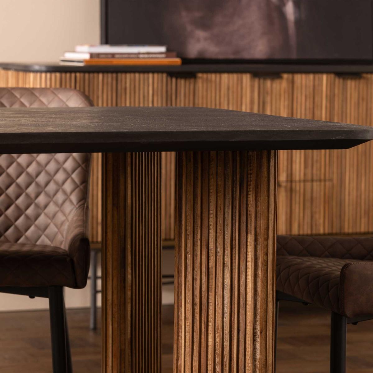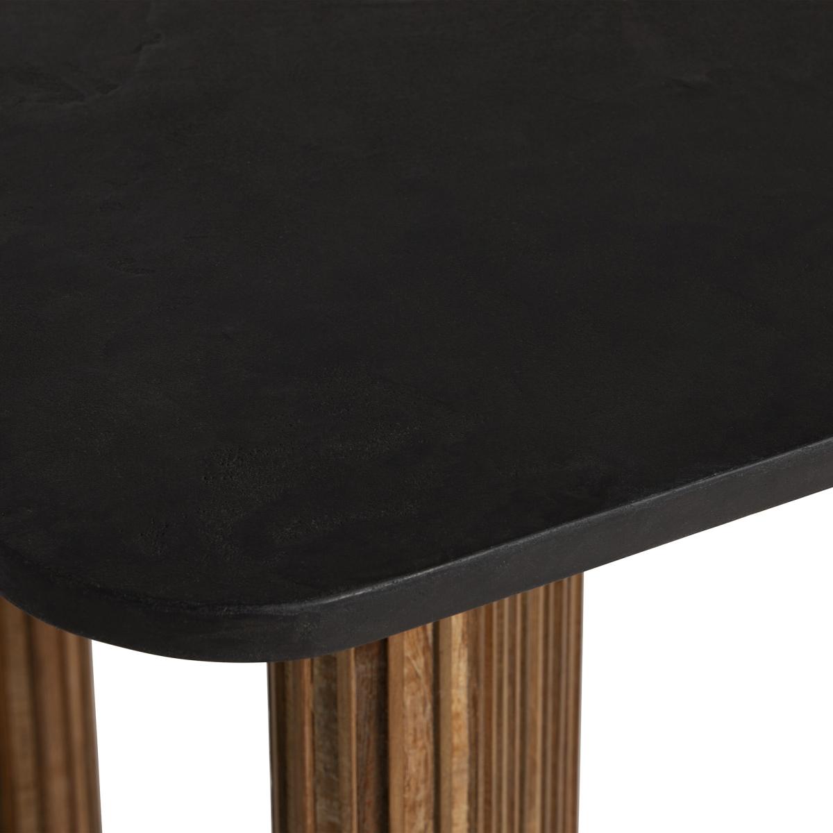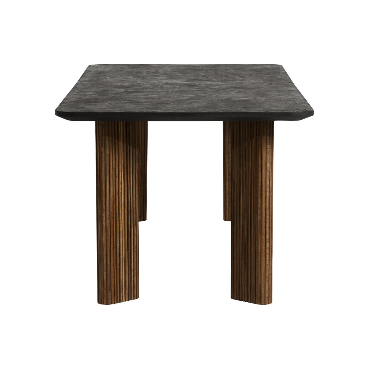 Introducing the Trinidad Reclaimed Teak Wood Rectangular Dining Table ndash; a testament to rustic elegance. Crafted from reclaimed teak wood, it embodies eco-conscious craftsmanship. The striking black tabletop exudes sophistication, perfectly complementing the fluted wood legs. Elevate your dining experience with the natural beauty and timeless charm of this exquisite table, adding a touch of rustic refinement to every meal.