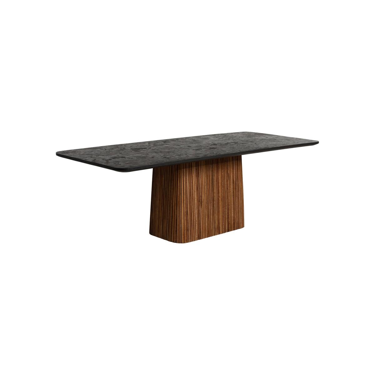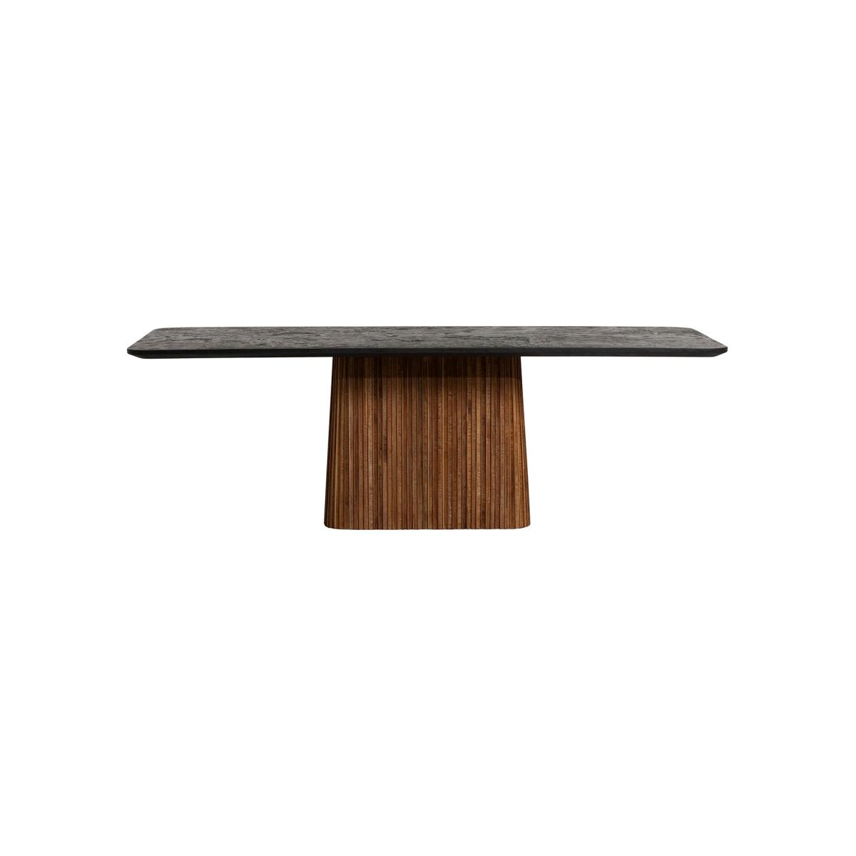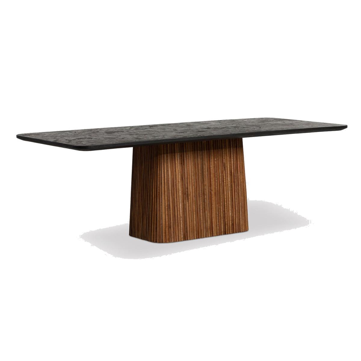 Experience rustic refinement with the Trinidad Reclaimed Teak Wood Pedestal Dining Table. Crafted from reclaimed teak wood, it boasts a stunning black tabletop atop a fluted wood pedestal base. Its eco-conscious design exudes sophistication, enhancing every dining experience. Comfortably seating 8, this table invites gatherings, adding a touch of natural beauty and timeless charm to your dining space.