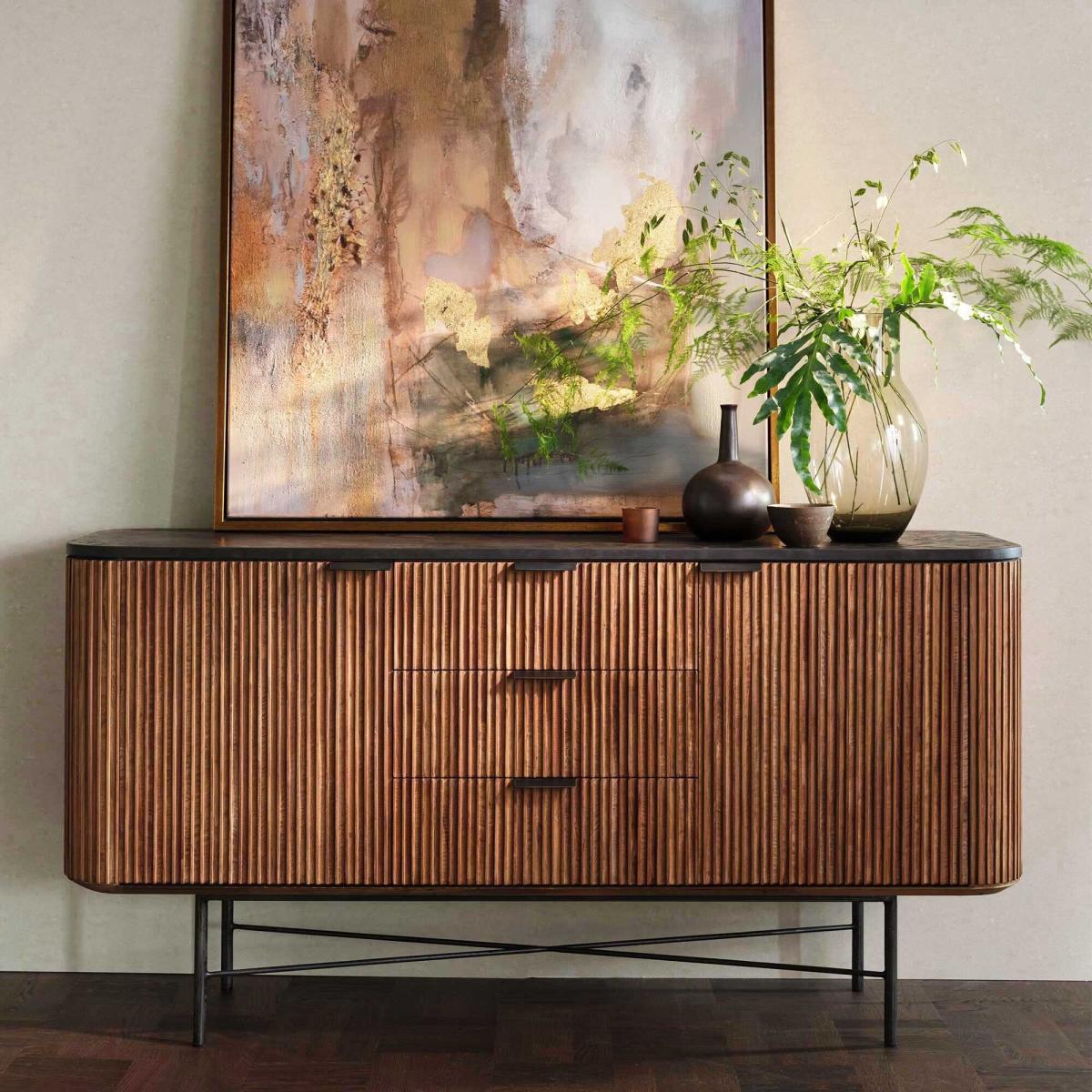 I love the fluted front and slim metal legs of this sideboard - it brings texture and warmth without feeling bulky. Its rich brown wood works equally well in Scandi, mid-century or industrial schemes and pairs nicely with both muted and jewel-toned palettes. For styling, keep the top simple: a round mirror or piece of artwork above, a low lamp or two vases at differing heights, plus a neat stack of books. Inside, use it to stow dining crockery, living-room kit or home-office supplies, and consider adding an LED strip for a soft glow when the doors are opened.