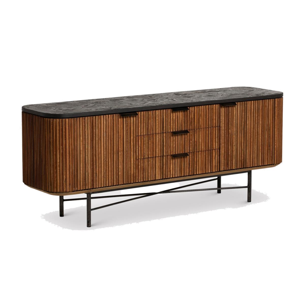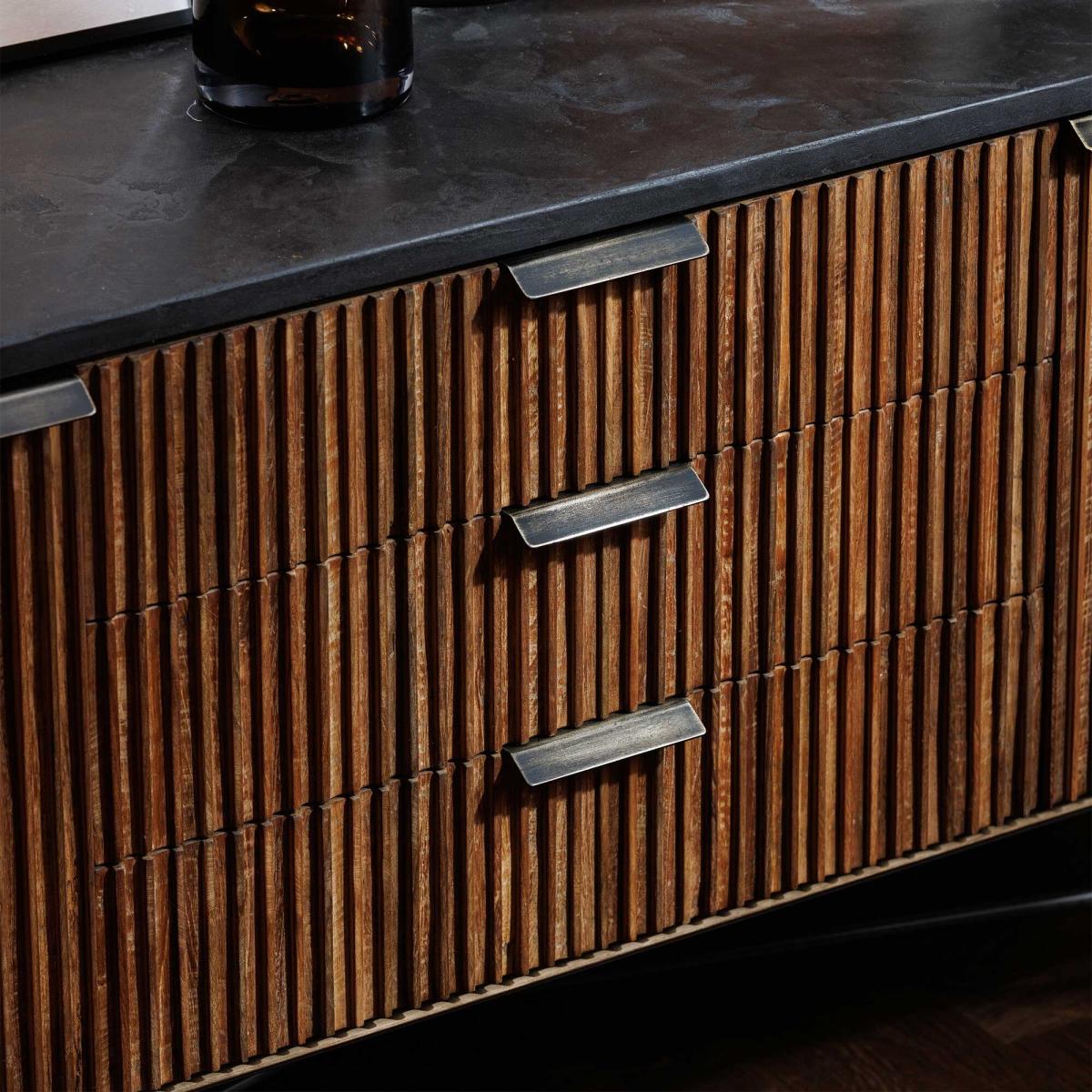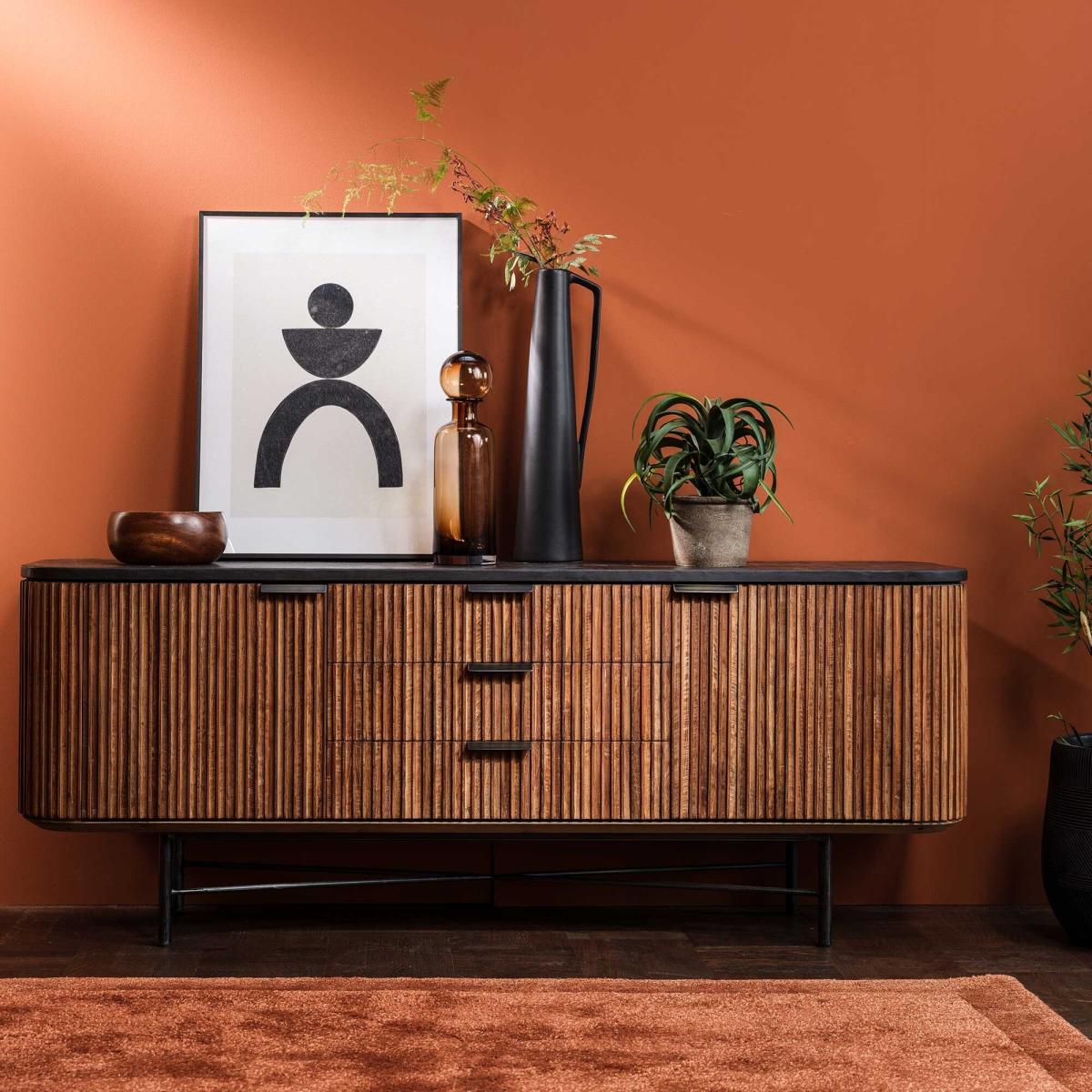 I’m a fan of the Trinidad unit for its clean lines and fluted wood front combined with slim, black metal legs - it feels equally at home in a mid-century scheme or a more pared-back, industrial-style living room. The dark, stone-effect top adds visual weight and gives you a hardwearing surface for remotes and speakers without looking fussy. Styling tip: keep tech neat by routing cables through the back and hiding consoles in the central drawers or on the adjustable shelf. Balance the width by flanking with a tall plant on one side and a simple lamp or stack of coffee-table books on the other. Neutral ceramics or a single framed print above will keep the look intentional rather than cluttered.