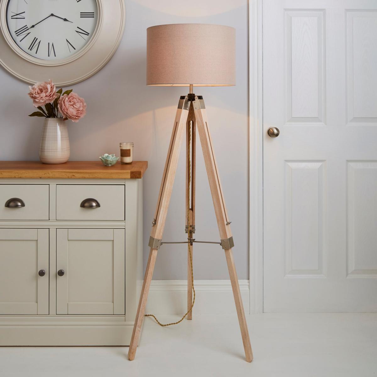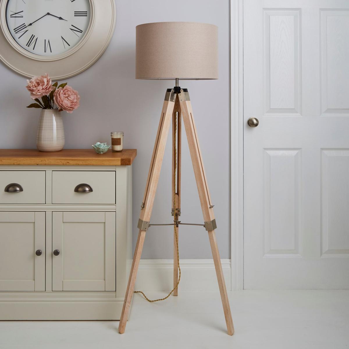 Stylishly crafted, this contemporary floor lamp features a wooden tripod design base with faux linen cylinder shade finished in a natural colourway. A perfect floor lamp to inject a modern and rustic touch to your home décor. This floor lamp comes with a 2 year guarantee.
