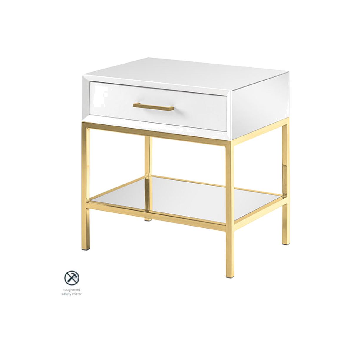 A distinctive, contemporary bedside table. Drawer fronts and surrounds with matt white paint finish. Sides, shelf and top finished in toughened mirrored glass. Stainless steel frame and handles with champagne gold finish. Soft close drawer runners.