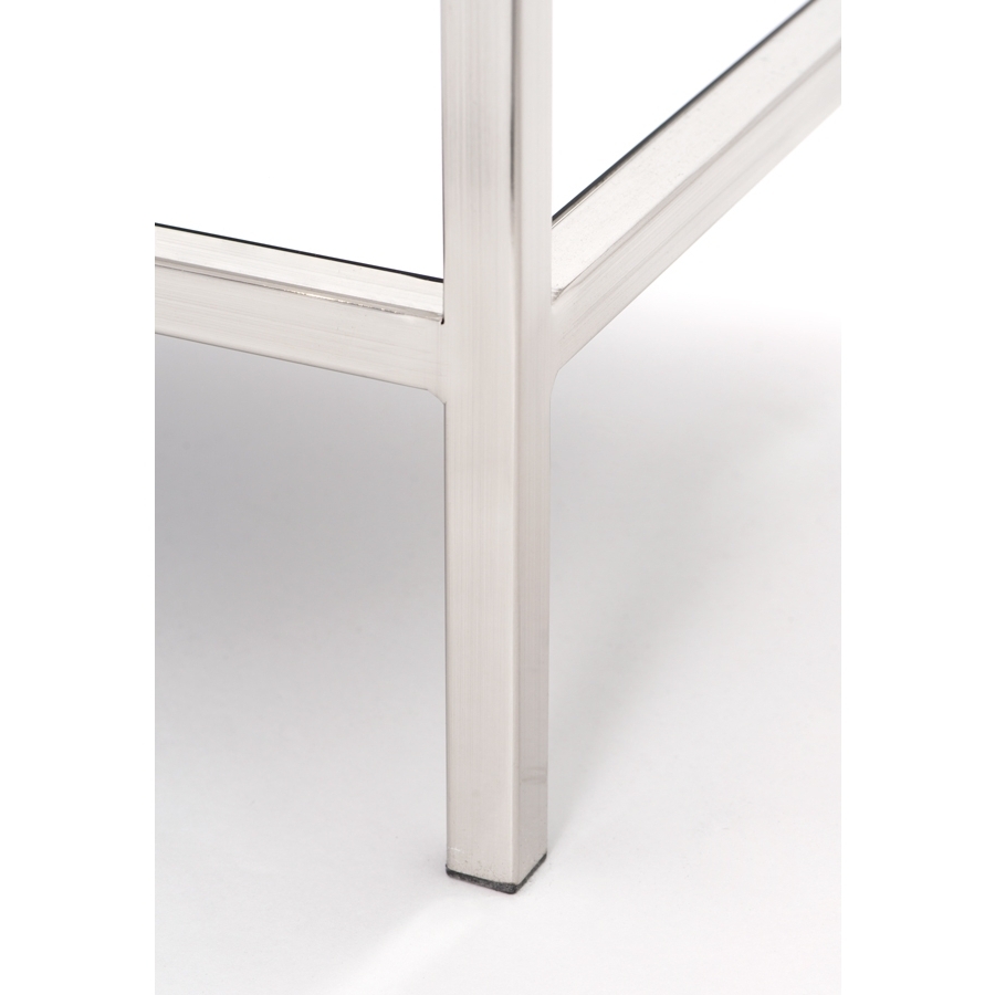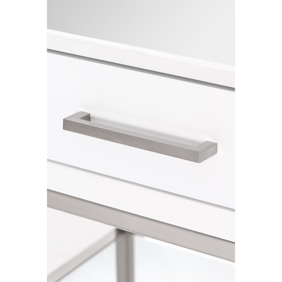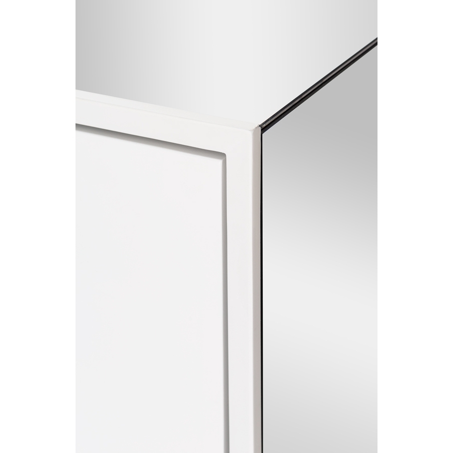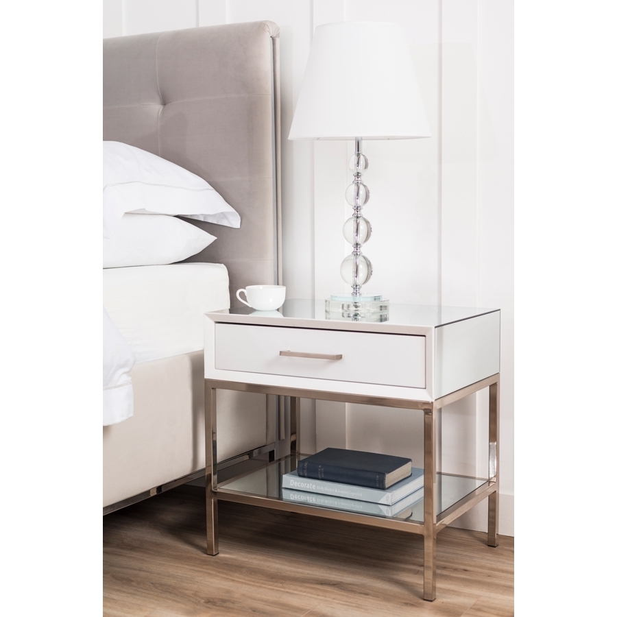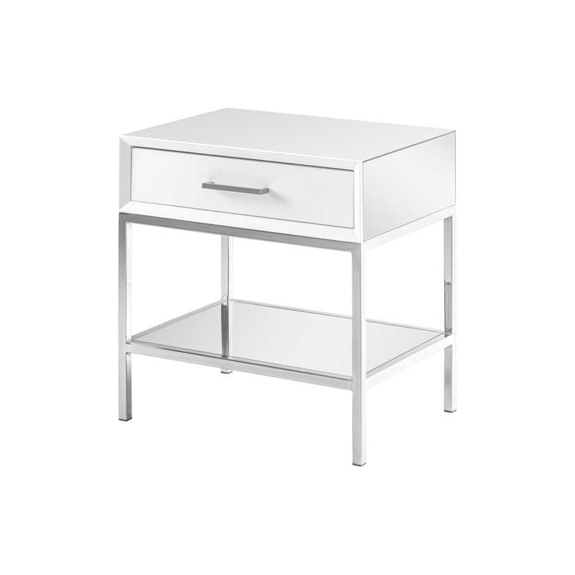 A distinctive, contemporary bedside table. Drawer fronts and surrounds with matt white paint finish. Sides, shelf and top finished in toughened mirrored glass. Brushed stainless steel frame and handles. Soft close drawer runners.