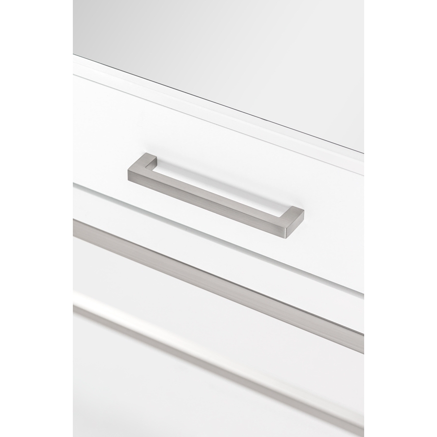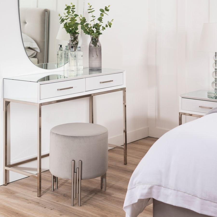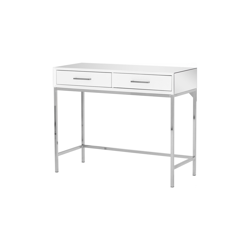 A distinctive, contemporary console table. Drawer fronts and surrounds with matt white paint finish. Sides and top finished in toughened mirrored glass. Brushed stainless steel frame and handles. Soft close drawer runners. Assembly required approximately 10 minutes.