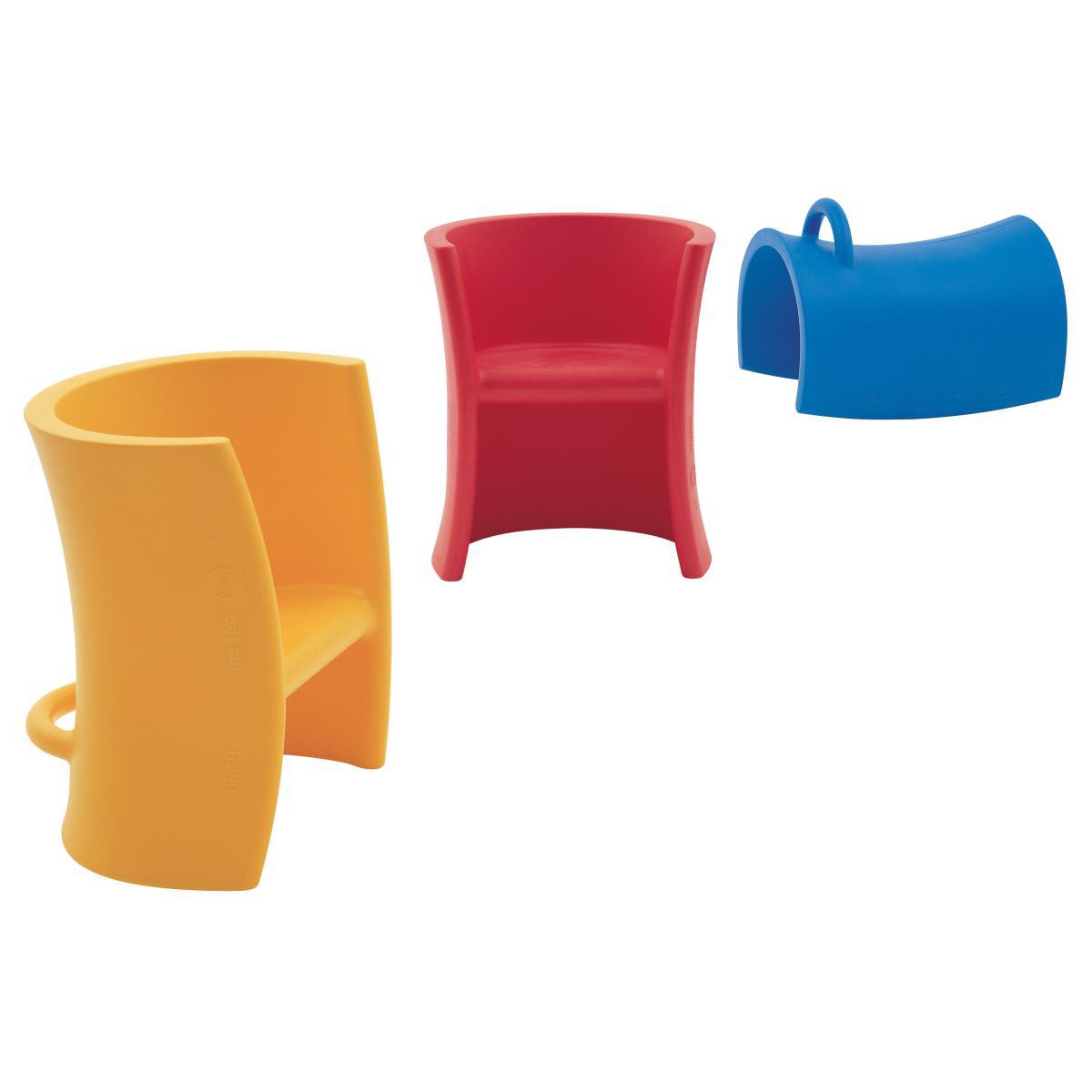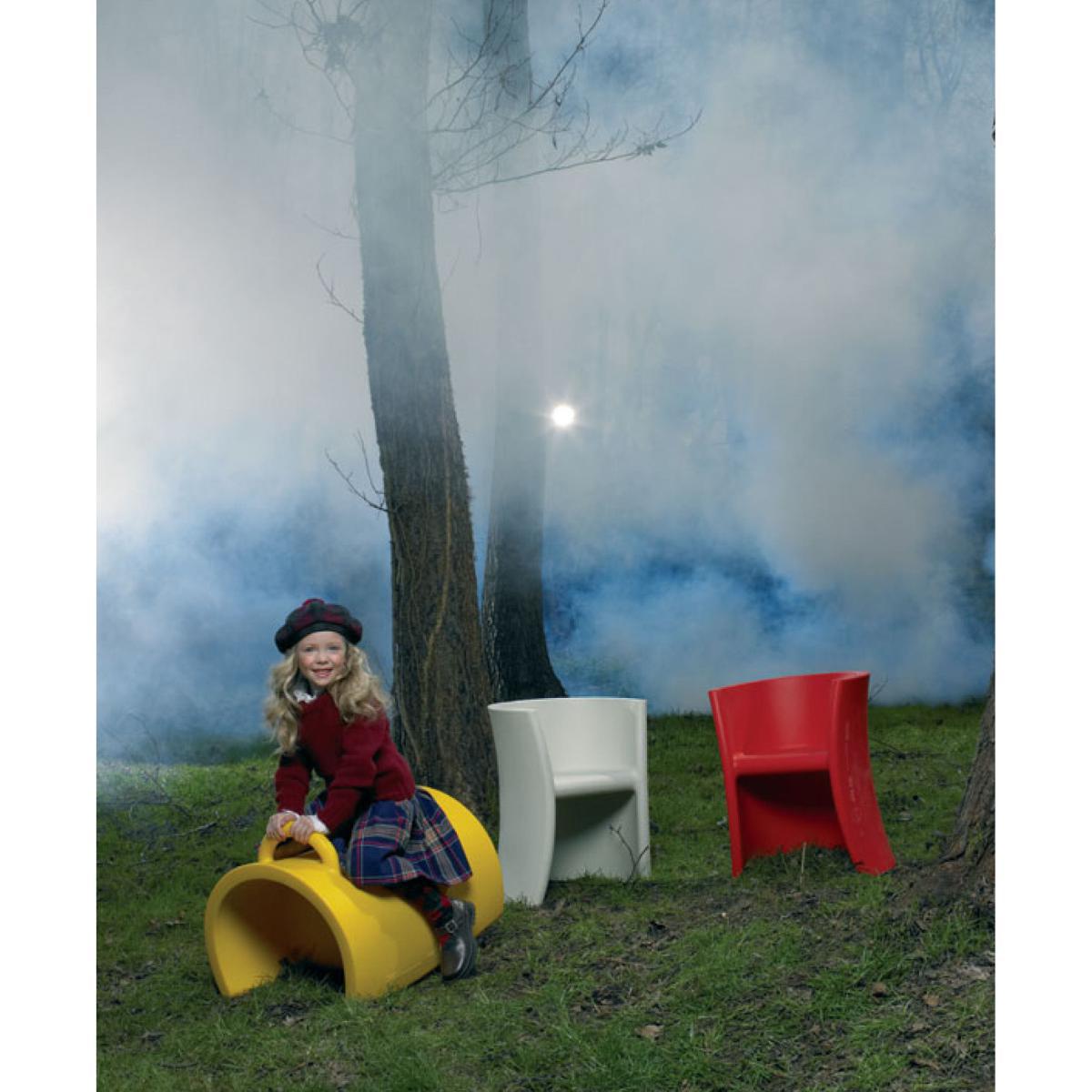 Trioli is an upside-down chair very surprising! All right gone out of the imaginary of Eero Aarnio, the famous nordic designer of the pop seats in bubbles forms , Trioli is a magic object. In forms barrel in half cylinder, the sat is not placed in the middle in order to allow two heights of sat. It suffices to return the chair to choose the sat preferred: the height more low allows hiding itself behind the file and the highest one to be like a king on his trone. Ergonomique but also playful, Trioli is a true toy. Put on flat, it becomes a seat to tips, a horse to the gallop, a bike , or again sit allows playing at jumps sheep. Exist in red, blue, yellow and white.