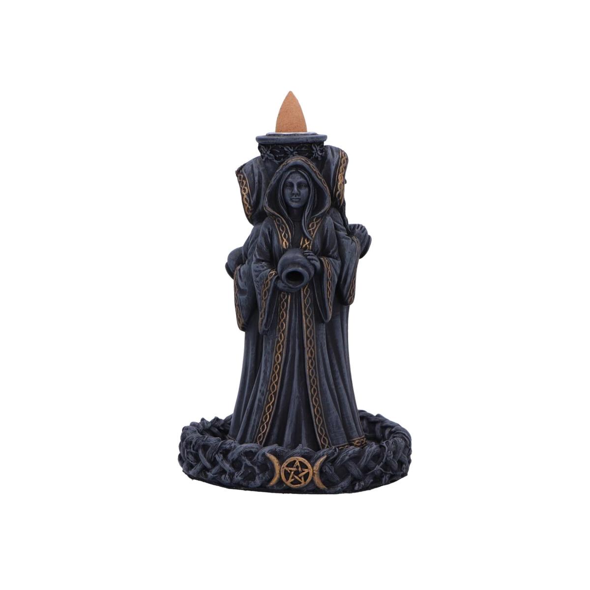 Embrace the sacred cycles of life with our Triple Moon Goddess Backflow Incense Burner from Nemesis Now's premium collection. Crafted from high-quality resin and painted in elegant black with intricate gold detailing, this burner depicts the symbols of maiden, mother, and crone encircling a central pillar. Atop the pillar, an incense cone delicately releases fragrant smoke, descending from pots held by each of the symbolic women. The smoke gracefully pools in a wreath of Celtic knots beneath them, creating a mesmerizing visual display. This backflow incense burner is a tribute to the ancient wisdom of the triple goddess and the interconnectedness of life's phases. As part of our extensive collection, it's perfect for those who seek to infuse their space with the magic and symbolism of the mother, maiden, crone. Explore our wide range of mother, maiden, crone, Wiccan, and witchcraft-themed giftware, each piece crafted to enhance your spiritual journey and connection to the divine feminine.