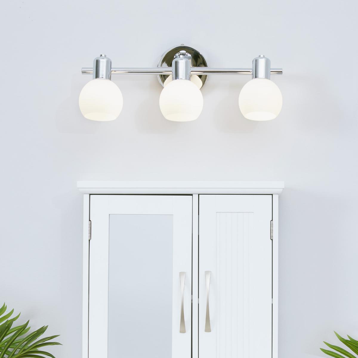 Light up your home with this modern Teamson Home Triple Sconce Light with Frosted Shades and Chrome Fixture. The sleek modern design and adjustable shades with dimmable lighting will add form and function to any room in your home.