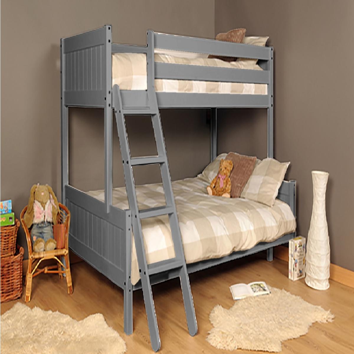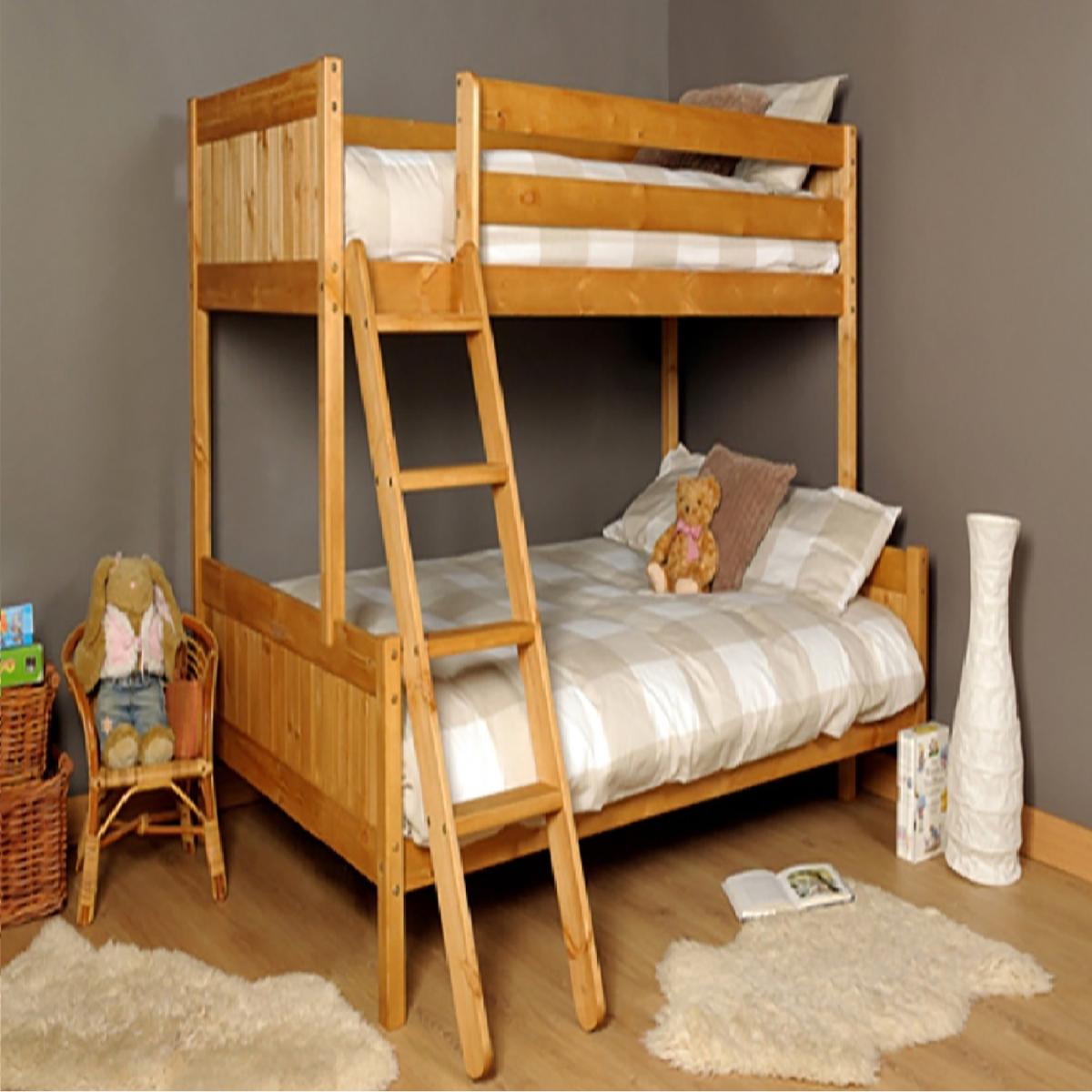 This Scandinavian solid pine triple bunk bed is manufactured from solid pine and has tongue and groove headboards and footboards. Both bunks feature slatted bases to give rigidity and support. A deep and wide-set ladder for ease of access to the top bunk, whilst being easy on the feet. The top bunk features safety rails all-round the bed to ensure your little one sleeps safely. This bunk has a 3ft Single bed on top and the 4ft Small Double on the bottom.