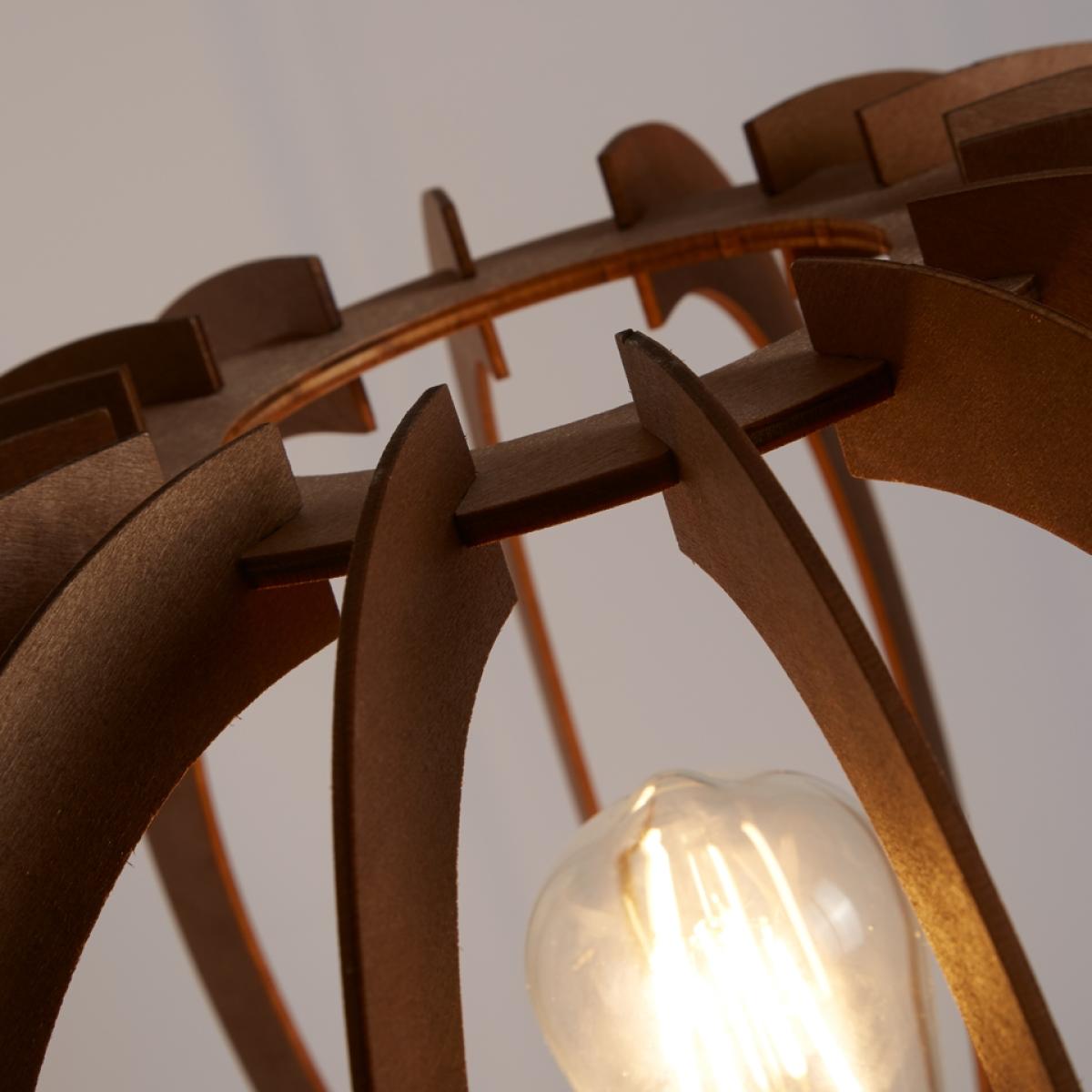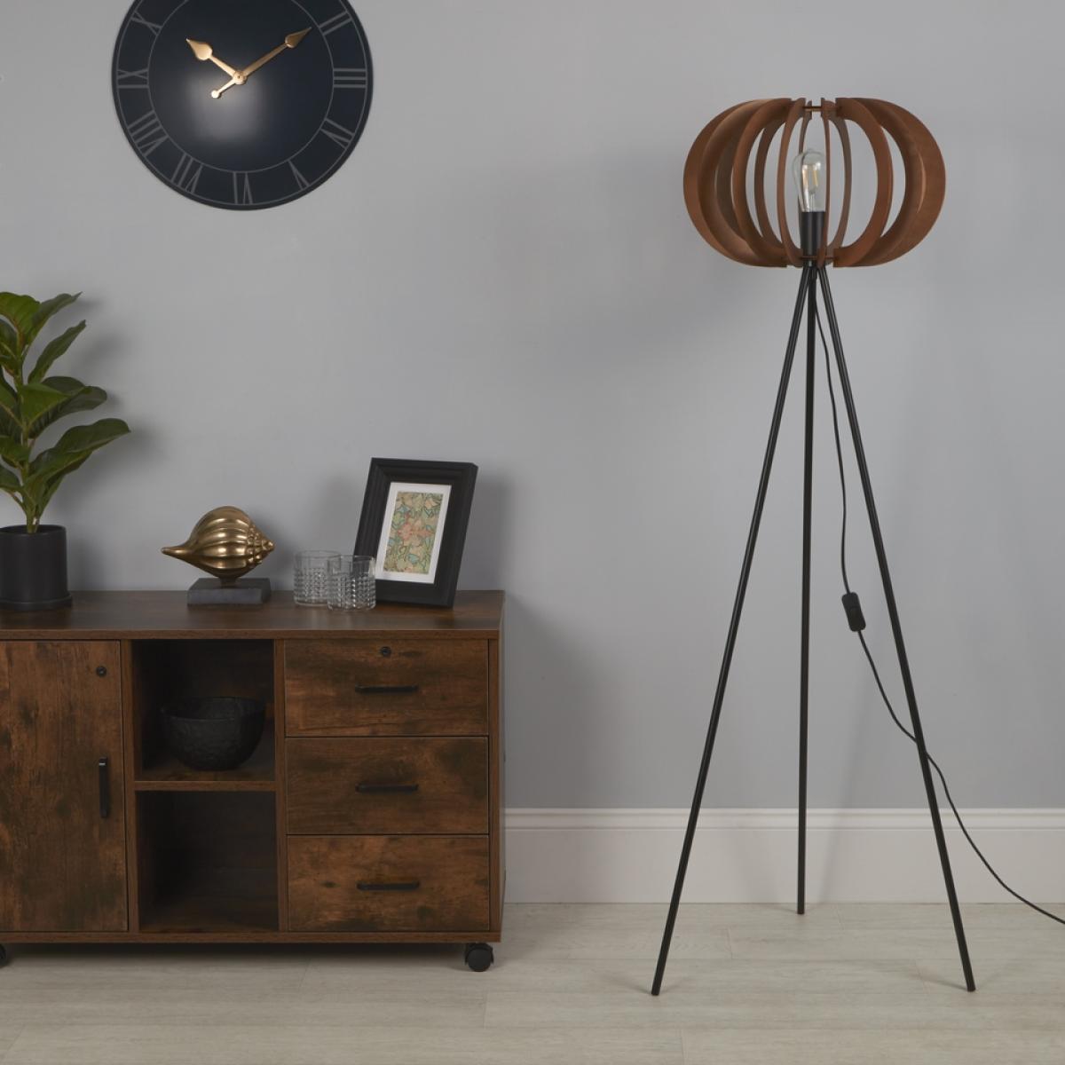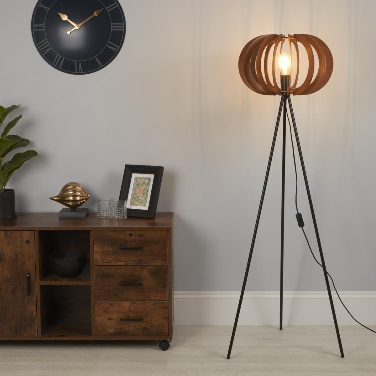 Add a contemporary finish to any living room, hallway or bedroom with this eye-catching floor lamp. With a black tripod base topped with a cut out shade in contrasting walnut, this floor lamp will be the stylish finishing touch to any modern home. The cut out shade leaves an exposed bulb, which will create beautiful light patterns when lit.