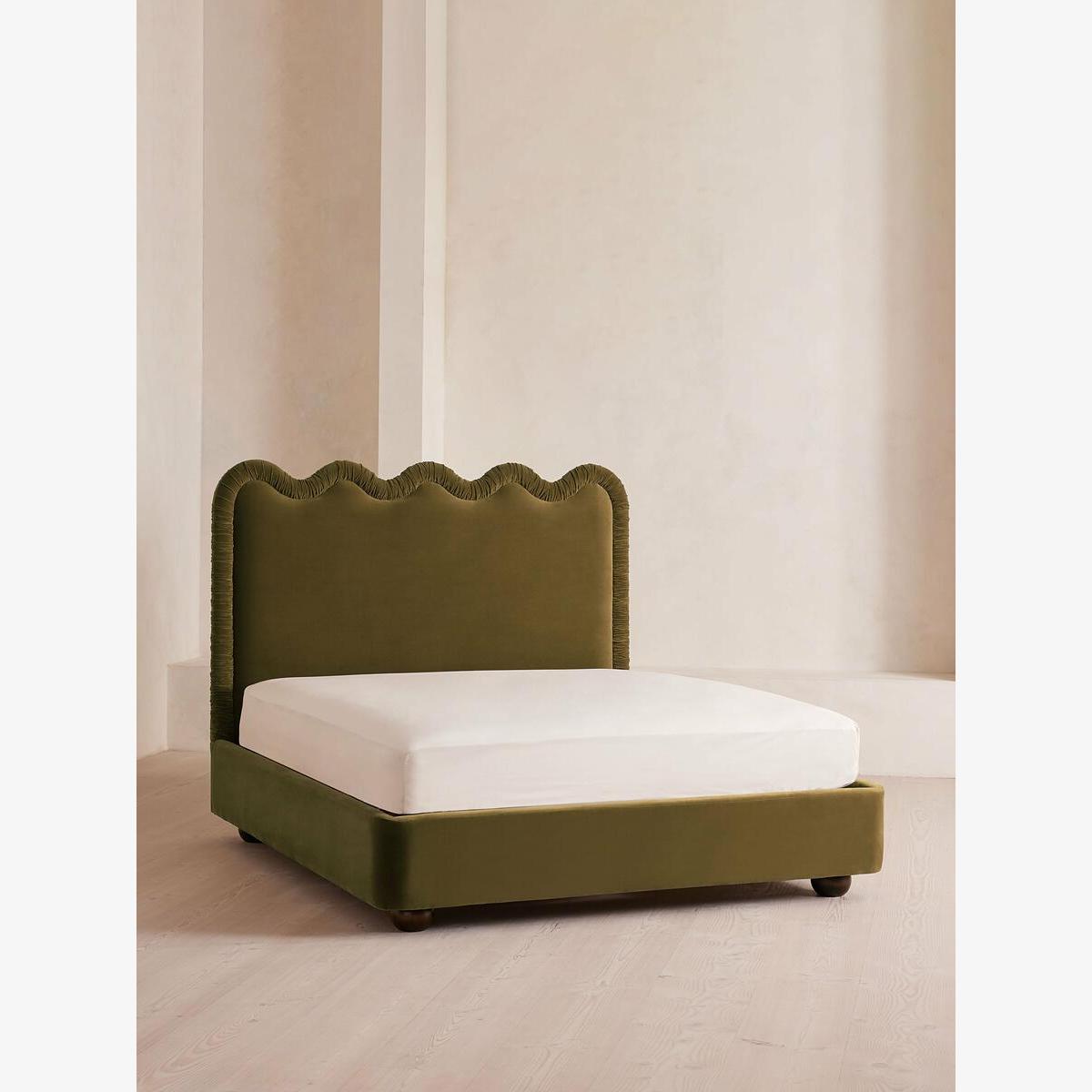 I’m a fan of the Tristan’s olive-green velvet and scalloped headboard for bringing depth and a hint of luxe without feeling over-the-top. Its low, plinth-style base makes it versatile enough for both contemporary and mid-century interiors, while the rich hue also complements boho-inspired or Scandi schemes. To style it, keep bedding crisp and neutral - think ivory linens with a textured throw in natural fibres. Add cushions in muted terracotta or soft grey to pick up on the olive tones, and bring in warm metals like brass or bronze for bedside lamps. A simple jute rug and a couple of houseplants will balance the look and keep it grounded.
