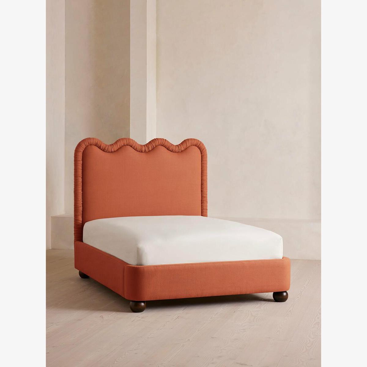 Taking inspiration from the interiors in Soho House Paris, this statement bed frame is finished with a playful waved headboard. It comes fully upholstered in your choice of rich-toned velvet or pure linen.