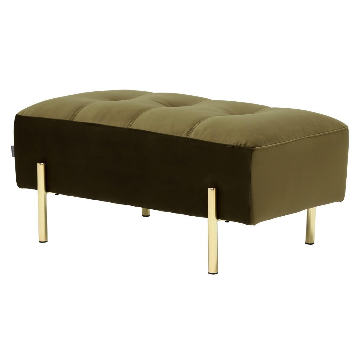 Design. A beautiful design that will bring edgy glamour into any modern interior, we present the Tristan Footstool in Lush Velvet Green with Gold Feet and Piping. Incredibly comfortable, it features a supportive foam core wrapped in soft fibre and feather – perfect to pop your feet on at the end of the day!.