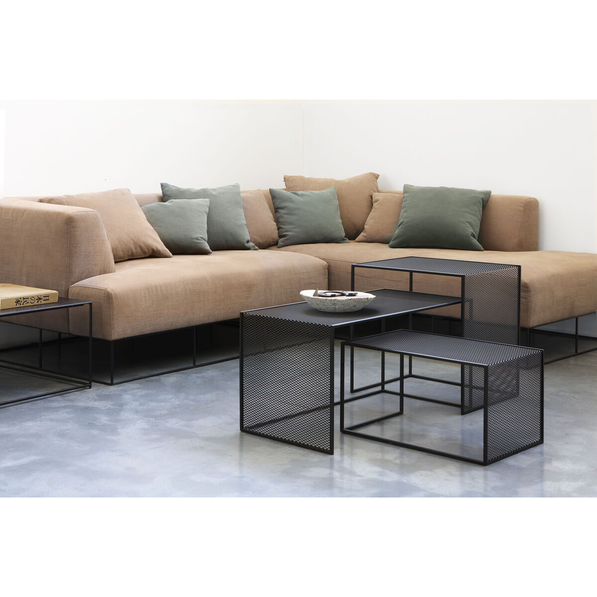 Made of steel mesh, Tristano coffee tables are a modern embodiment of industrial aesthetics. Very fashionable in the fifties (notably with Mathieu Matégot), the metal mesh plays with transparency and light. Close up, the micro-perforations create a graphic, delicate, aerial effect. From afar, it creates a surprising optical effect, ethereal and vibrating! The Tristano coffee table enriches your room with its expressive presence without being overpowering. Tristano coffee tables are available in three dimensions that can overlap, forming a graphic, ethereal whole. This piece of furniture completely corresponds to the philosophy of the ZEUS brand: creating items which are simple, authentic, functional and economic. A quest for the essential achieved by total expertise in materials and incomparable skill to work metal. Zeus furniture is made by skilled craftsmen in Italy, near Modena. Each piece is made by hand: the metal is cut, assembled, welded and painted by hand. Each piece is unique. Steel is a recyclable material and any metal scrap not used during manufacturing is recycled for re-use. Zeus furniture is built to last: highly durable, this furniture can be handed down from generation to generation.