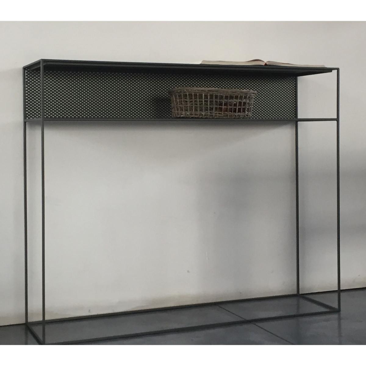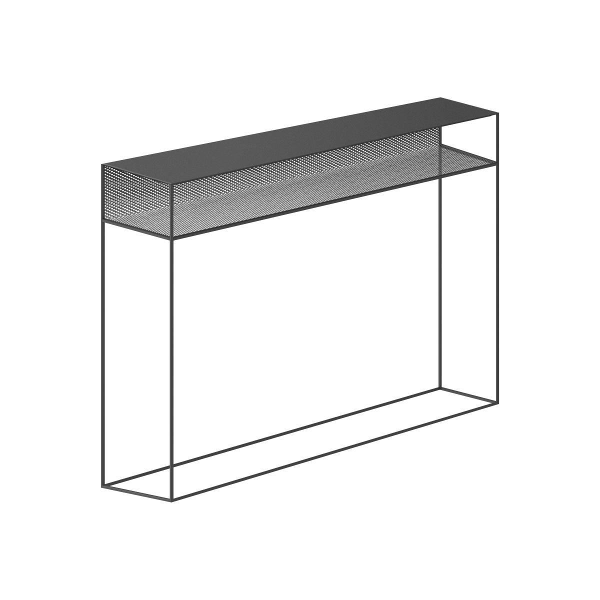 Made of steel, the Tristano collection combines solid surfaces and openwork surfaces. The solid sheet sits next to steel mesh which forms an ethereal, elegant texture, playing with transparency. Depending on the observer’s point of view, the metal mesh lets light and looks through, or on the contrary, prevents it. This simple, clean console table is a modern embodiment of industrial aesthetics. The shelf below the top provides additional storage space. This piece of furniture completely corresponds to the philosophy of the ZEUS brand: creating items which are simple, authentic, functional and economic. A quest for the essential achieved by total expertise in materials and incomparable skill to work metal. Zeus furniture is made by skilled craftsmen in Italy, near Modena. Each piece is made by hand: the metal is cut, assembled, welded and painted by hand. Each piece is unique. Steel is a recyclable material and any metal scrap not used during manufacturing is recycled for re-use. Zeus furniture is built to last: highly durable, this furniture can be handed down from generation to generation.