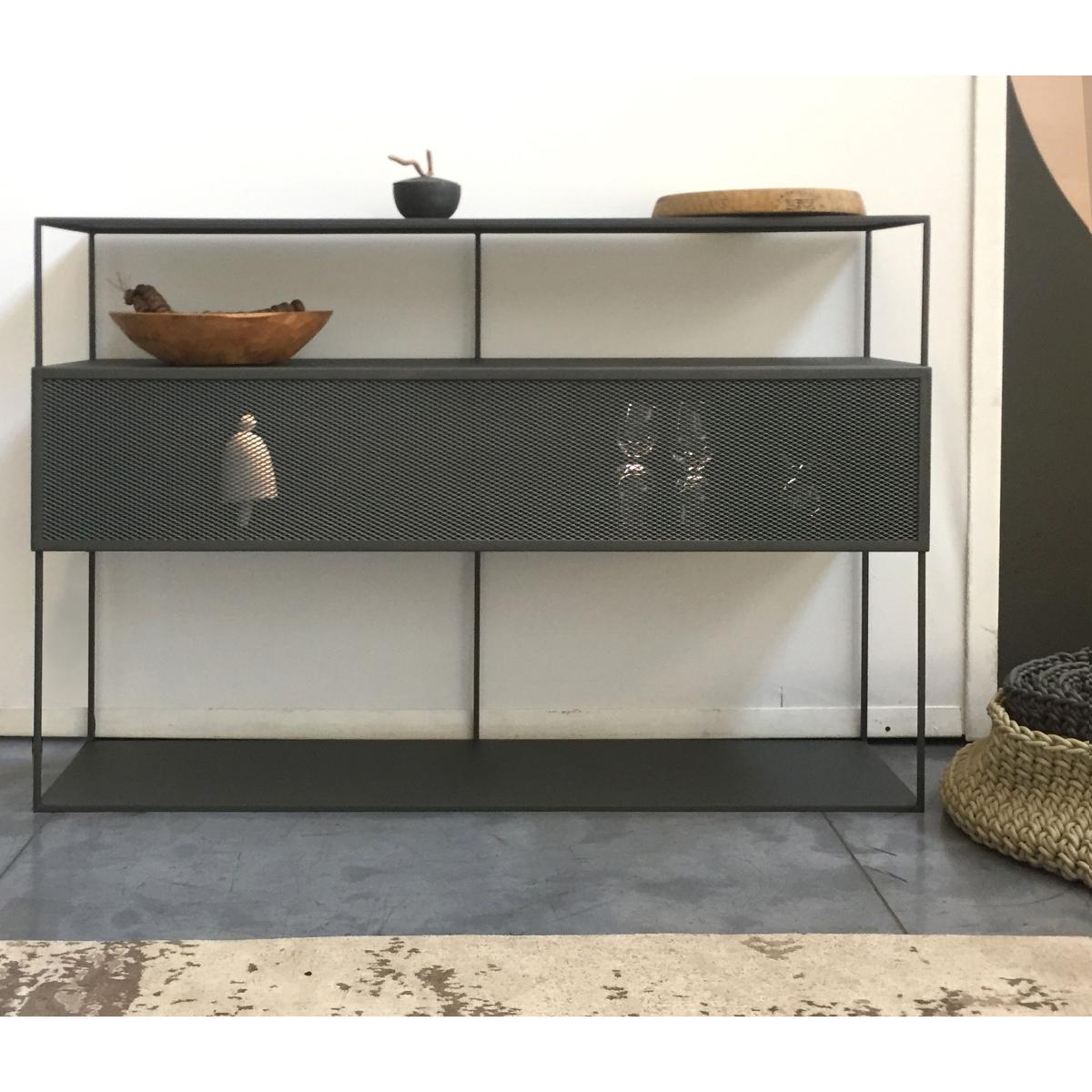 Made of steel, the Tristano collection combines solid surfaces and openwork surfaces. The solid sheet sits next to steel mesh which forms an ethereal, elegant texture, playing with transparency. Depending on the observer’s point of view, the metal mesh lets light and looks through, or on the contrary, prevents it. This simple, refined dresser is a modern embodiment of industrial aesthetics.