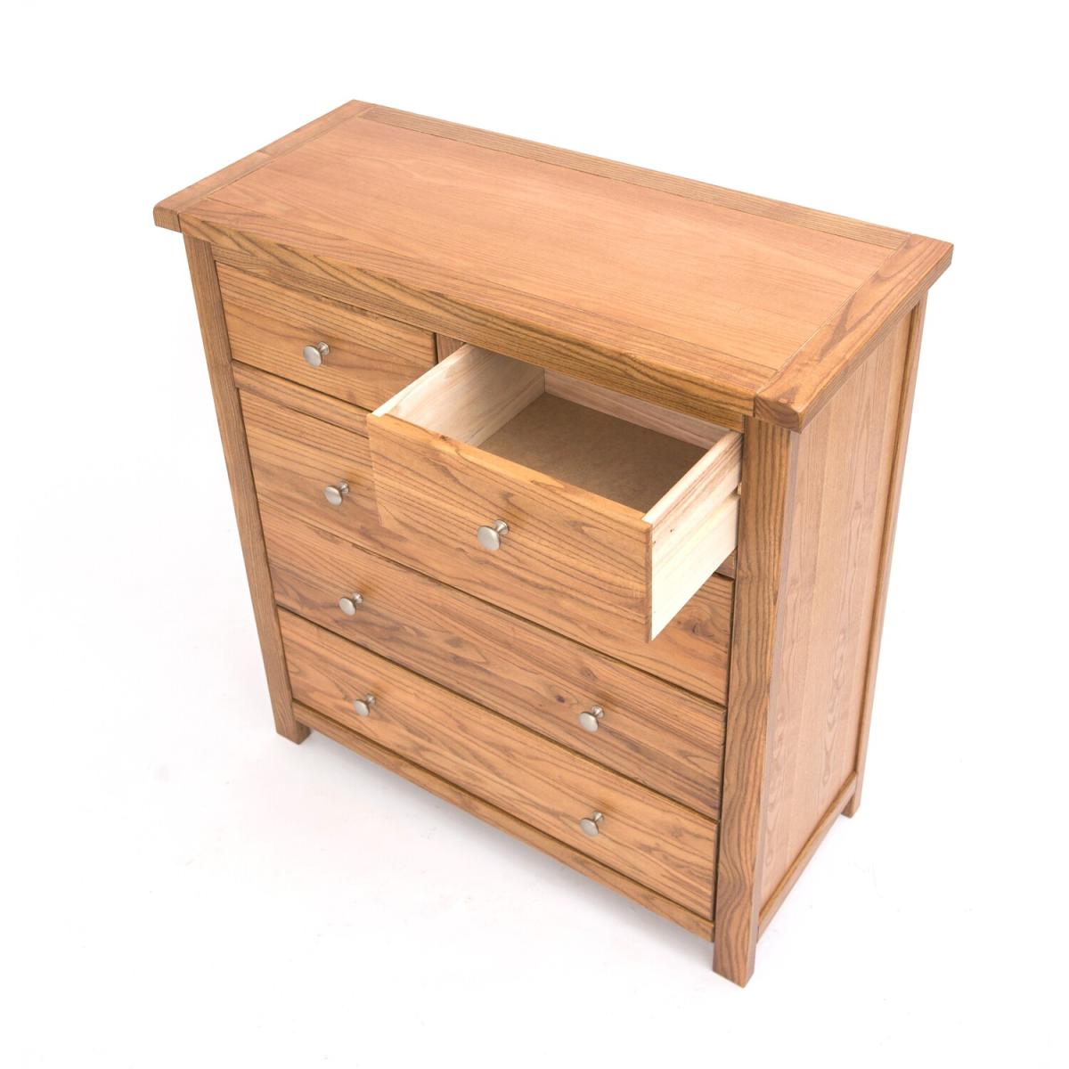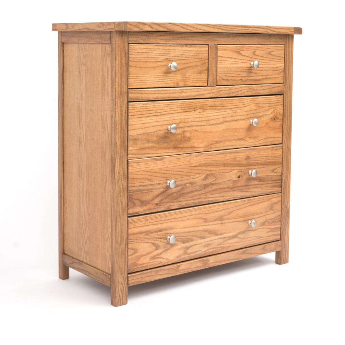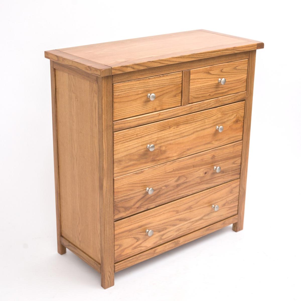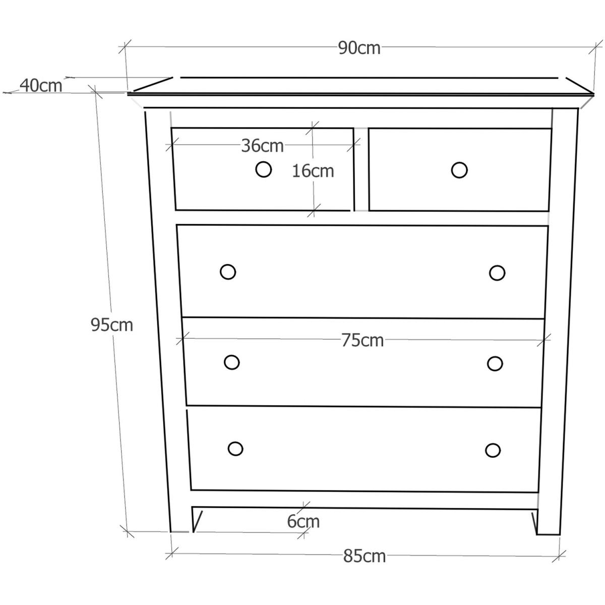 Our Trivento collection has a simple but pleasing design and is produced by our skilled craftsmen to the highest standards using responsibly sourced solid wood and veneers. All items are made using a combination of solid hard wood and veneers and are carefully hand finished on a light colour using a high quality eco friendly water base lacquer. A useful 2 over 3 drawer chest for your bedroom or elsewhere in your home. The 2 smaller size drawers have plenty of space to store your underwear while the 3 bigger drawers will take your folded clothes, gymwear or indeed bedding and towels to keep your home organised. The space on top is perfect for a matching mirror or indeed displaying your favourite family photos. The top has a 3cm thick solid wood frame, making it extremely sturdy. Added to these features is a simple construction for easy home assembly, making it a great value product to be taken home today.