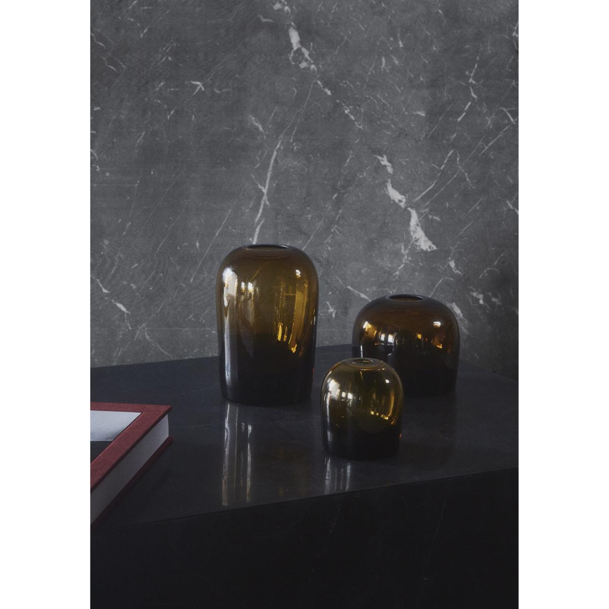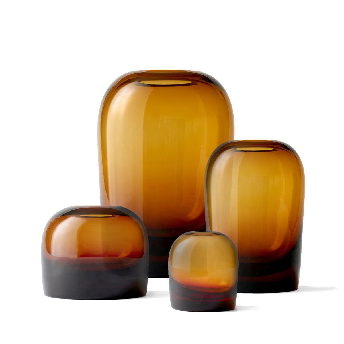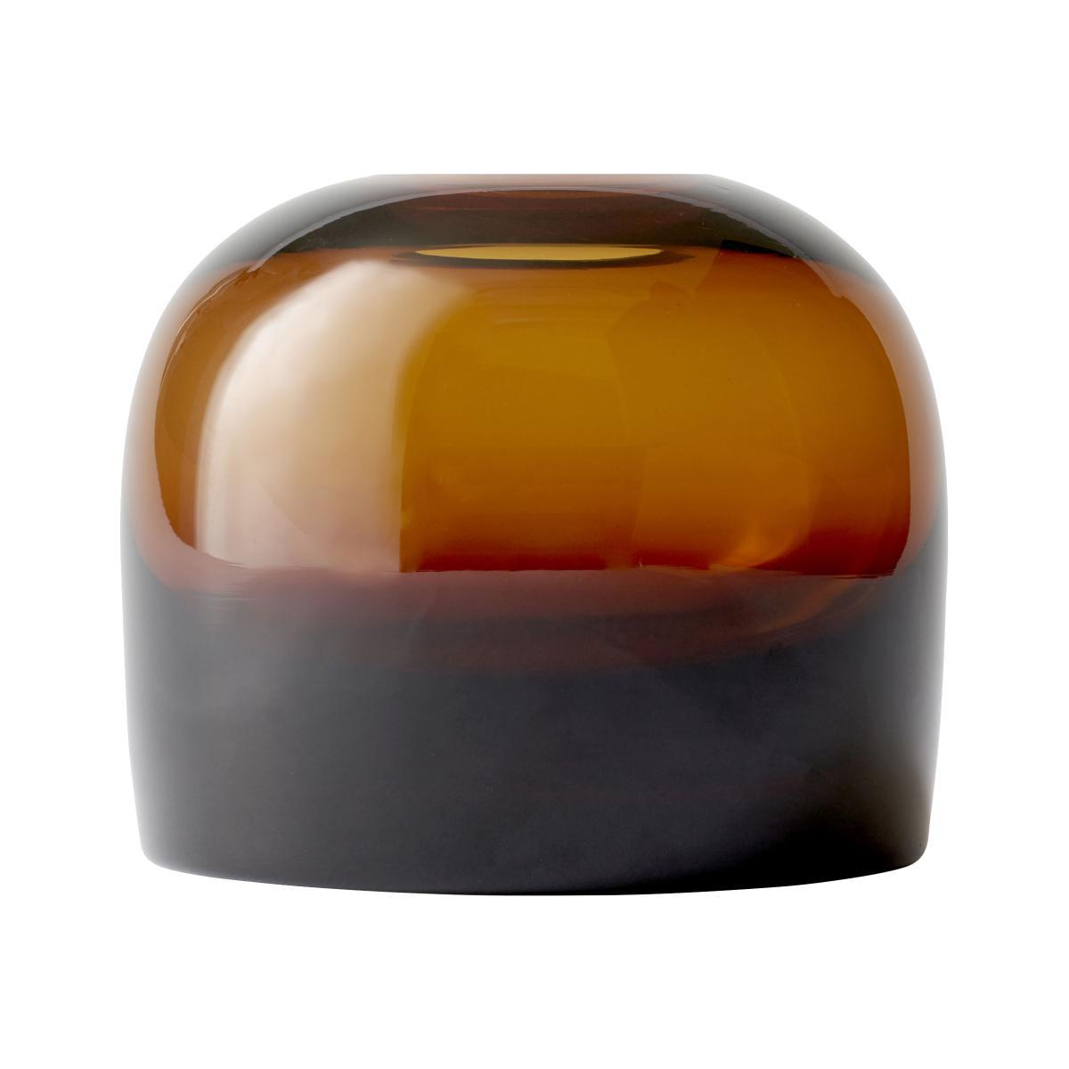 Colour and transparence. Drawn by Norwegian designers Anderssen & Voll, the Troll vase is the result of research into modulations in the thickness of glass to generate variations in colour. The sides of this vase in tinted glass progressively slims, forming a delicate colour scale. Made from hand blown glass, this object is the result of remarkable artisan work. The round and sleek lines showcase the smooth and tactile material. The pair of Norwegian designers chose to name this vase Troll, as in Scandinavian mythology, trolls live in ponds and lakes. Like water in a pond, this vase gets darker as the quantity of material increases.