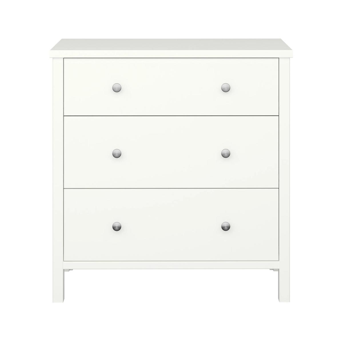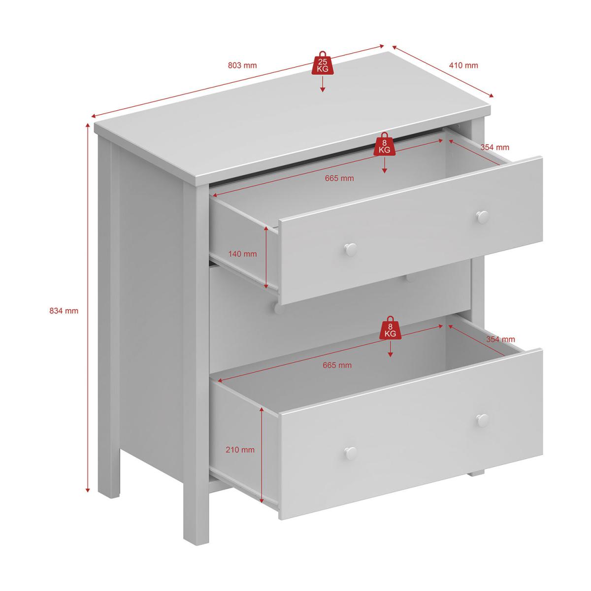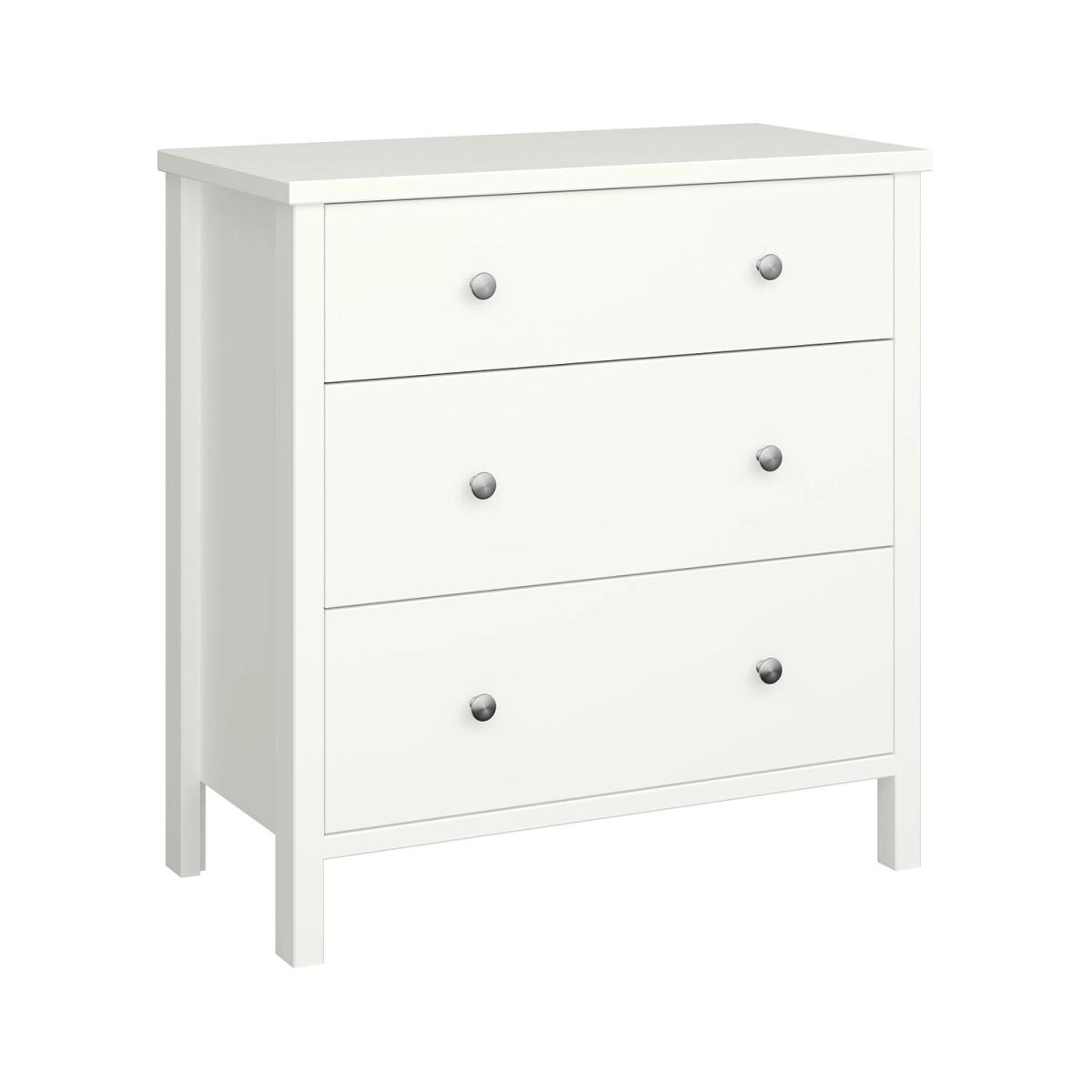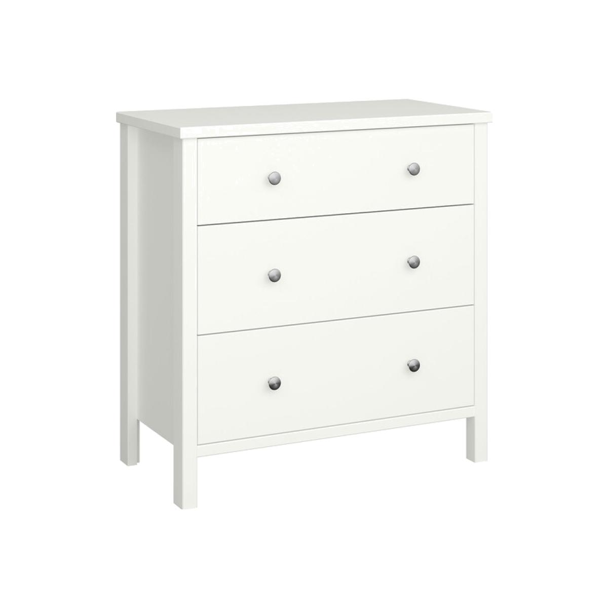 The Tromso 3-Drawer Chest of Drawers is a beautiful piece with classic Scandinavian lines and stainless steel handles for a contemporary finish. Made with easy-clean solid MDF for your convenience, the drawers feature easy-glide under-slung runners and matching drawer interiors. This piece is a sturdy and durable design for any home and features plenty of space for your clothes and accessories, making it the ideal bedroom piece.