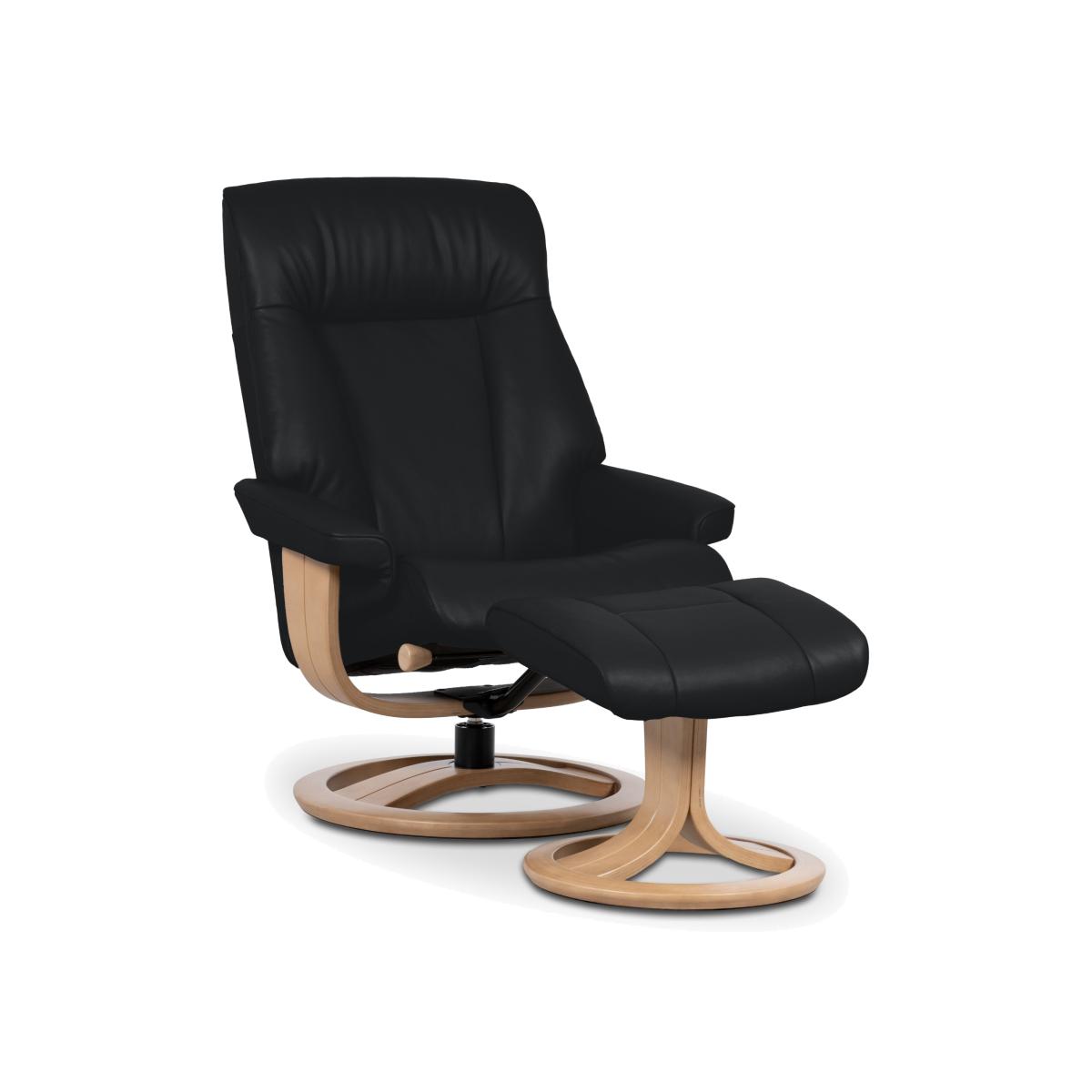 Enjoy cool retro design on a grand scale. This fabulous swivel recliner chair and footstool is the perfect combination of style and comfort. In 100% leather. Why you'll love it Retro-inspired leather swivel reclining chair and footstool combo. The effortless way to recline, swivel and put your feet up in style. Generous proportions for all-day lounging. Adjustable headrest makes it even easier to relax. Dynamic lumbar support eases an aching back. Premium quality foam cushioning for exceptional comfort and support. Extra strong tubular steel frame comes with a lifetime guarantee. Manual recliner mechanism with an easy-to-use lever operation. Gorgeous 100% leather upholstery in a huge range of colours. Both pieces have circular bases. Handmade exclusively for Furniture Village. This large leather swivel chair and footstool is part of our Effortless collection. What you need to know Self-assembly required. Medium comfort level. Seat suspension: sinuous spring. Seat cushioning: cold cure moulded foam. Cushioning is fixed. Back suspension: sinuous spring. Back cushioning: cold cure moulded foam. Cushioning is fixed. Arm cushioning: cold cure moulded foam. Please allow time for the recliner mechanism to ease. Minor gaps are necessary to ensure ease of motion and may be exaggerated depending on floor type. Leather has unique marks and characteristics with variation in colour and texture. Leather softens with use. Smoothing the tops of leather cushions prevents signs of visual comfort. Please read our upholstery care guide for more advice.