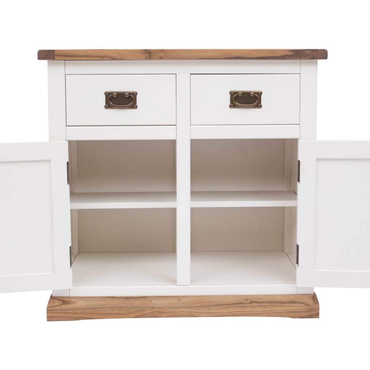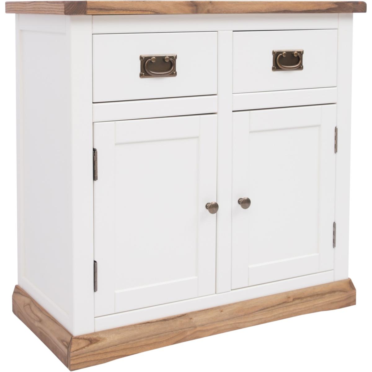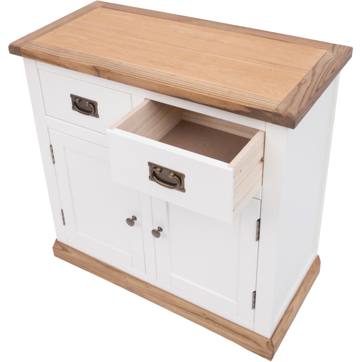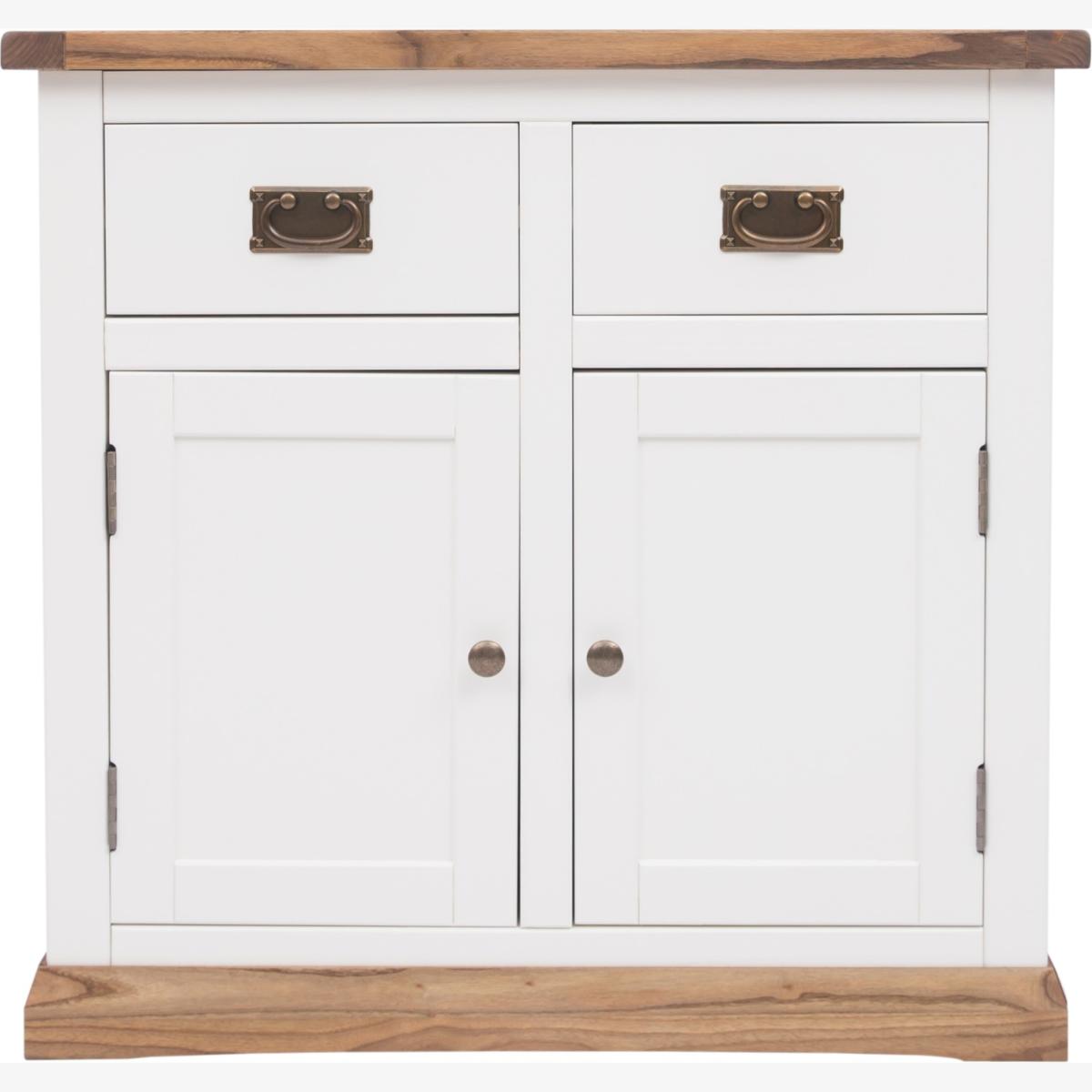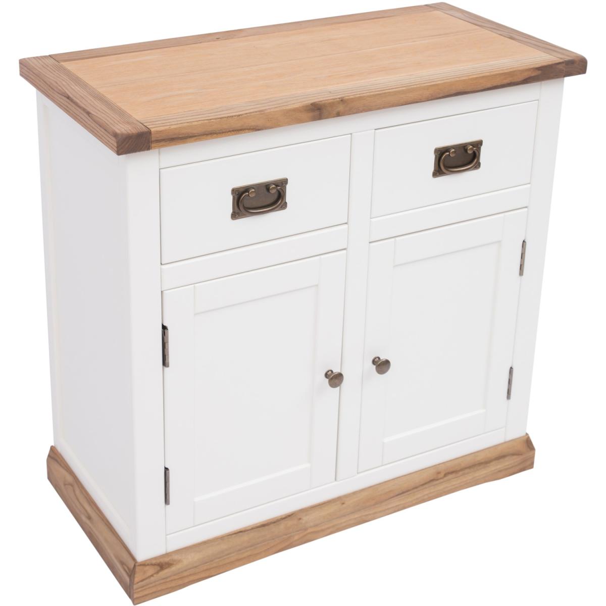 Our Tropea collection has a simple but pleasing design and is produced by our skilled craftsmen to the highest standards using responsibly sourced wood and veneers. All tops are made using a combination of hardwood and ash veneer and are carefully hand waxed giving it a great look. The body is finished with a high quality eco-friendly water base paint on an off-white colour. A compact 2 door 2 drawer sideboard ideal for your kitchen, dining room or lounge. The two doors conceal a large cupboard space for storing crockery, bottles or glassware and there is a shelf to help you organise your contents too. Above this there are two drawers for cutlery, napkins, place mats or maybe even keeping essential paperwork to hand. These attributes combined with a simple construction for easy assembly makes it a great value product to be taken home today.