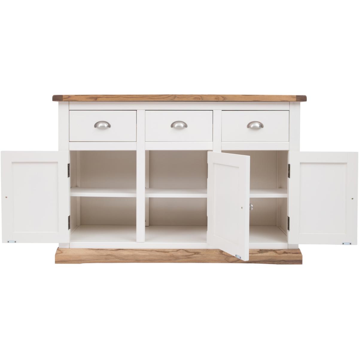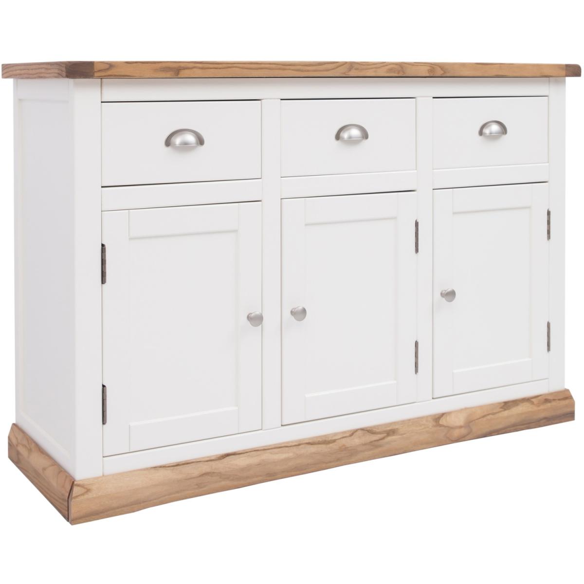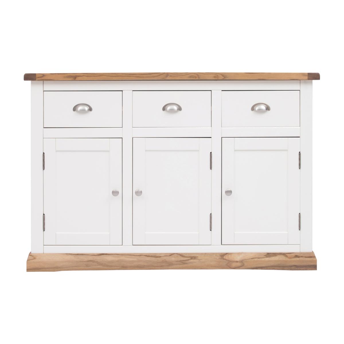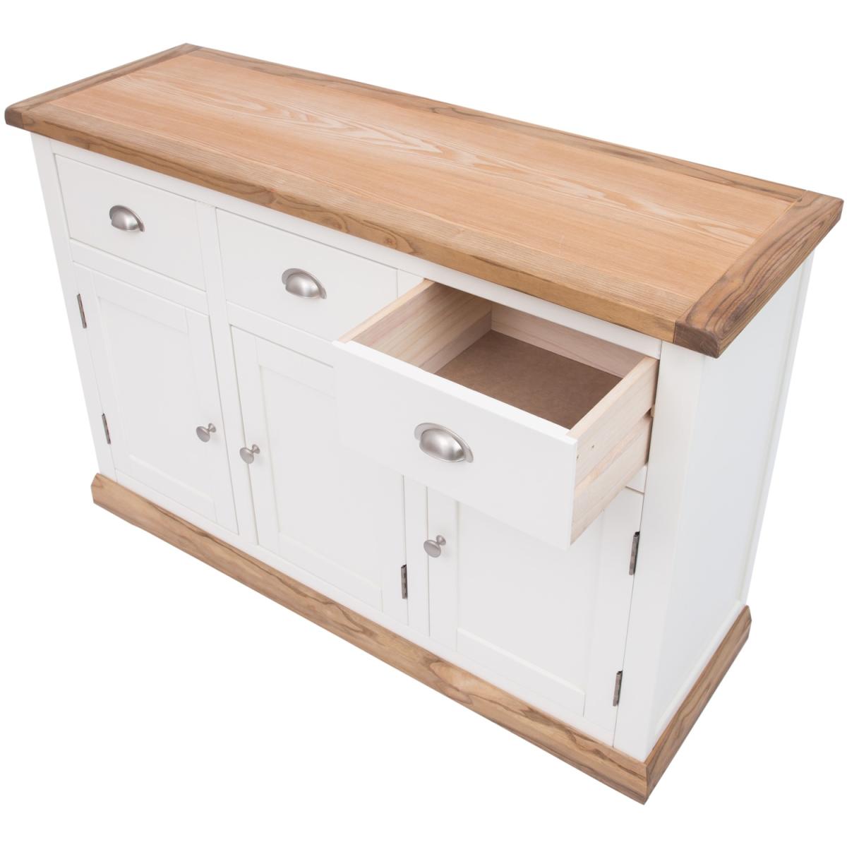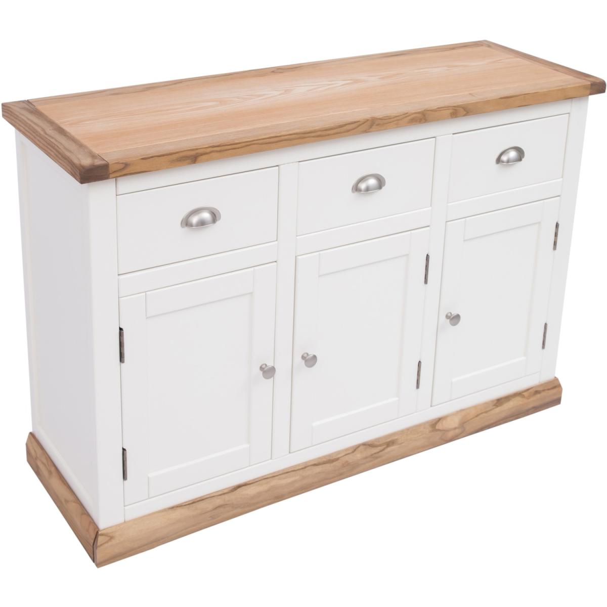Our Tropea collection has a simple but pleasing design and is produced by our skilled craftsmen to the highest standards using responsibly sourced wood and veneers. All tops are made using a combination of hardwood and ash veneer and are carefully hand waxed giving it a great look. The body is finished with a high quality eco-friendly water base paint in an off-white colour. This large 3 door 3 drawer sideboard will look at home in your dining room or lounge. The three doors conceal a large cupboard space for storing crockery, bottles or glassware and there is also a shelf to further organise your contents. Above this there are three drawers for storing your cutlery, napkins, coasters or even paperwork you need to hand. These attributes combined with a simple construction for easy assembly makes it a great value product to be taken home today.