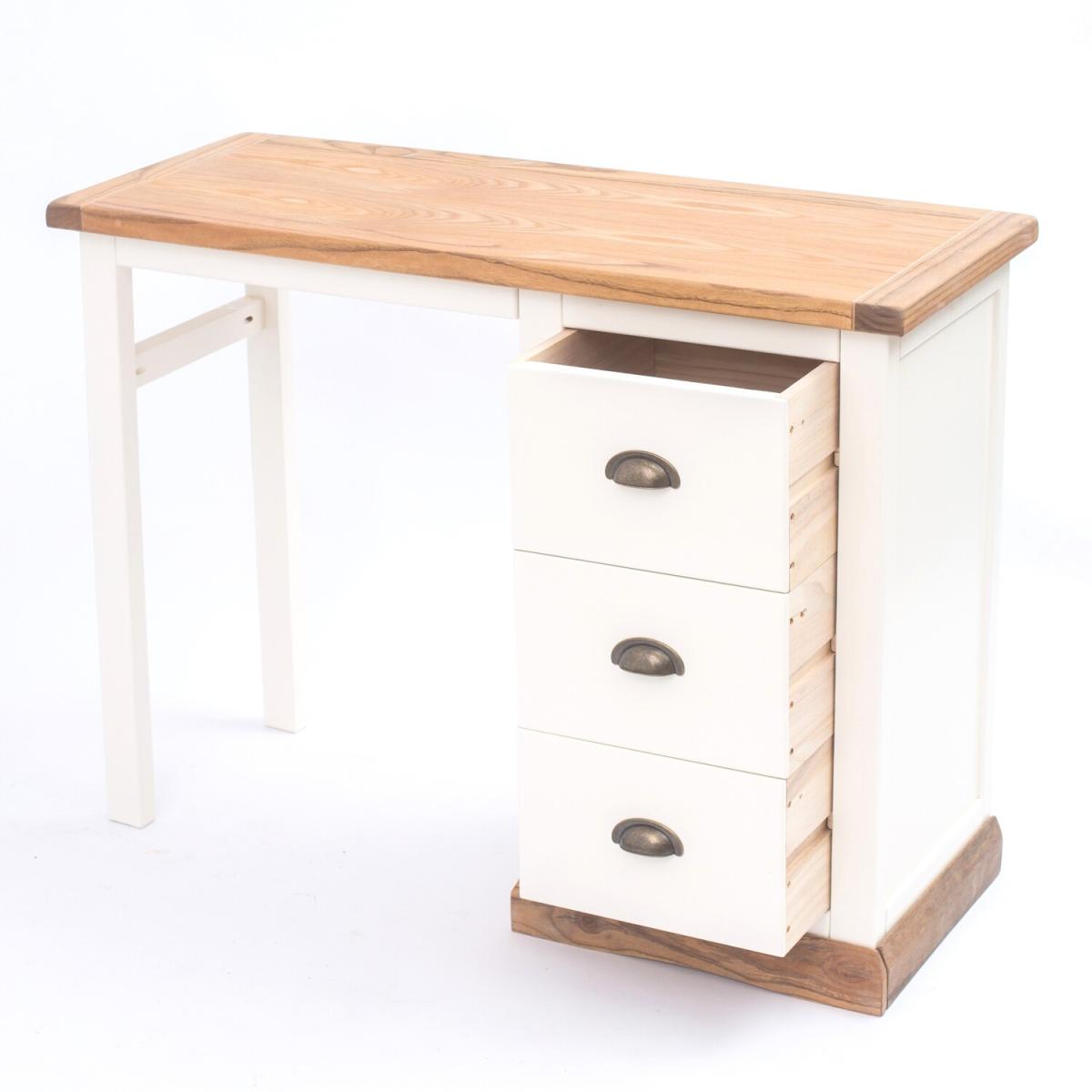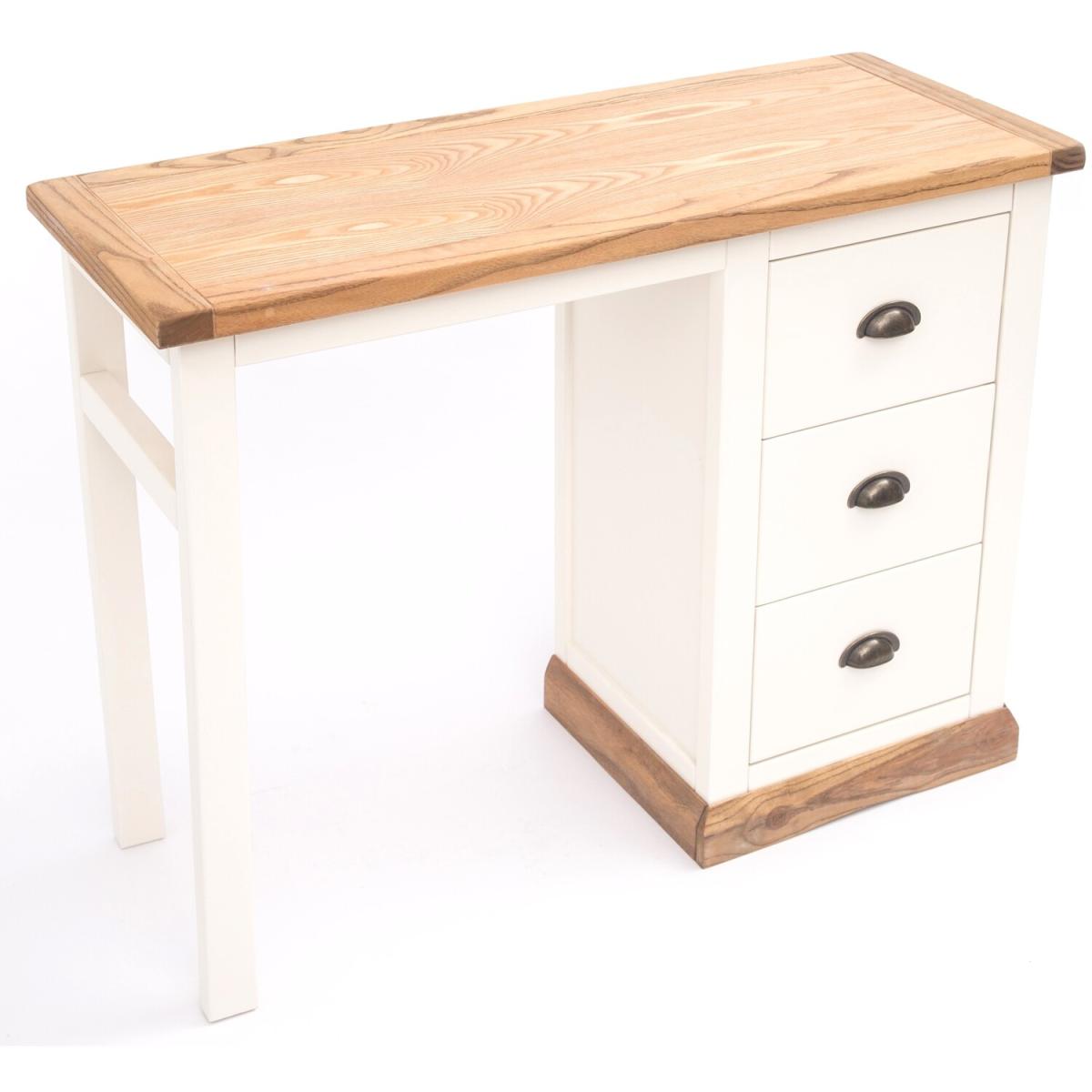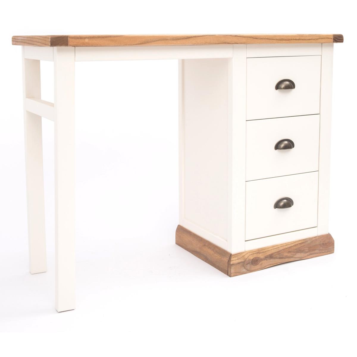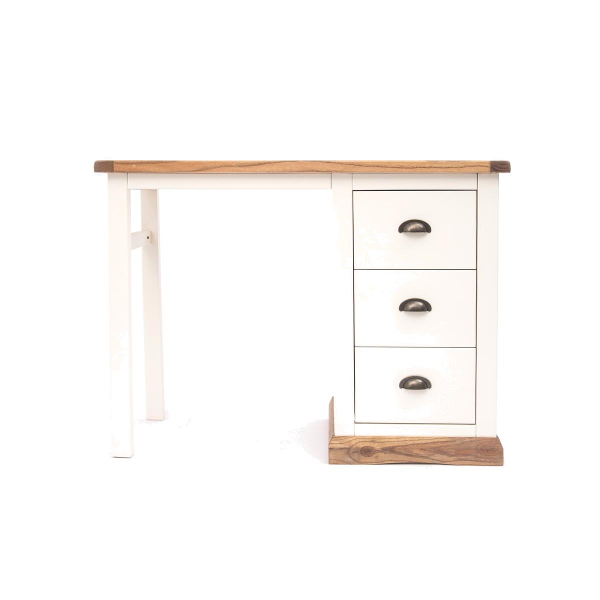 Our Tropea collection has a simple but pleasing design and is produced by our skilled craftsmen to the highest standards using responsibly sourced wood and veneers. All tops are made using a combination of hardwood and ash veneer and carefully hand waxed, giving them a great look. The body is finished with high-quality eco-friendly water base paint in an off-white colour. A versatile 3-drawer desk dressing table for your home, the perfect multifunctional piece for your bedroom. The 3 drawers offer plenty of space for your belongings whether being used as a desk or dressing table. The pedestal part can be positioned to the left or right-hand side when assembling. Why not add the mirror and stool to complete your set These attributes combined with a simple construction for easy assembly makes it a great value product to be taken home today.