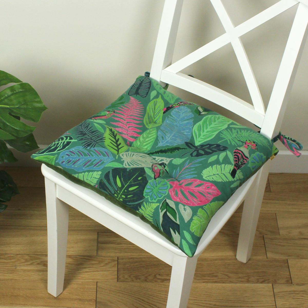 Bring tropical feels to your home with our tropical seat pads, featuring beautiful birds amongst exotic leaves in vibrant green, pink, mint and blue shades. With a contrasting velvet on the reverse, this will be suitable for a more subtle look.