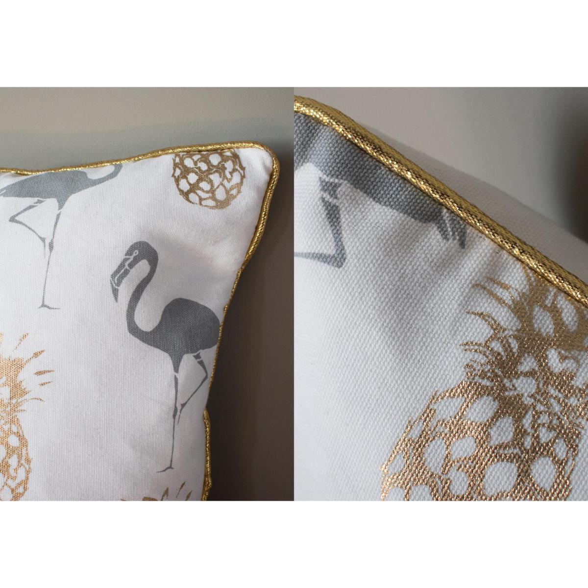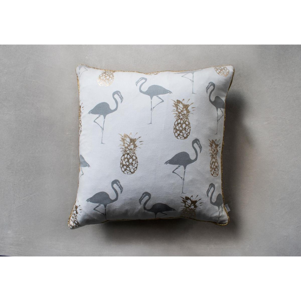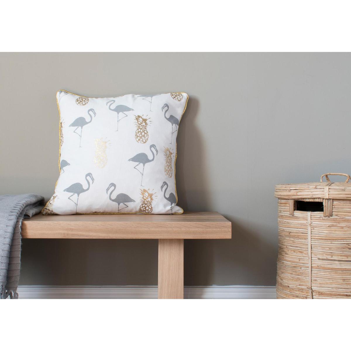Blending colour, style and comfort, the Tropical Luxe cushion is one not to be missed. Filled with feathers that are wrapped in a natural cotton cover for extra softness, its quirky print makes a bold style statement: grey flamingo motifs are combined with striking golden pineapples and matching golden piping throughout. The Tropical Luxe is ideal for those who are looking for that statement piece to give their homes an instant style update.