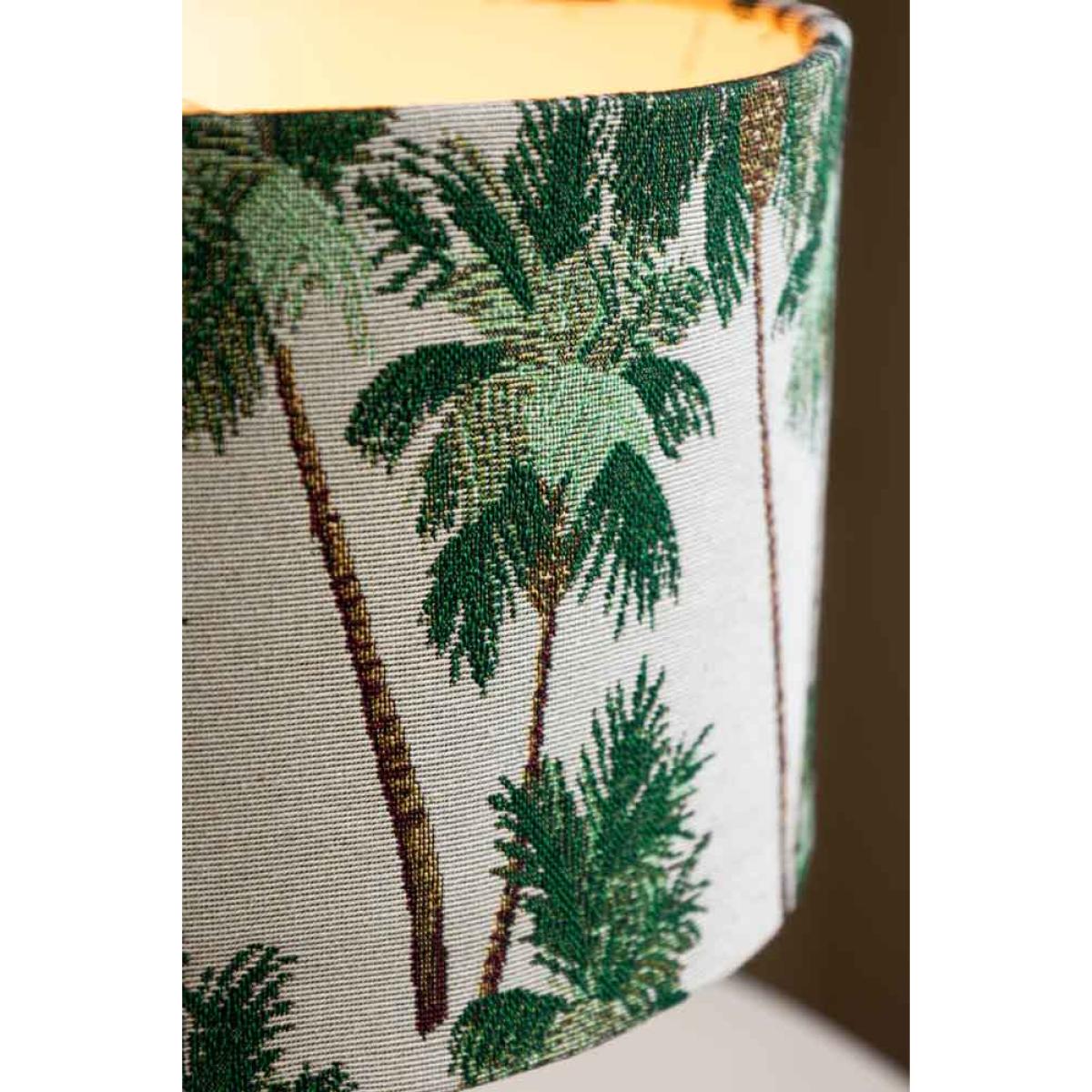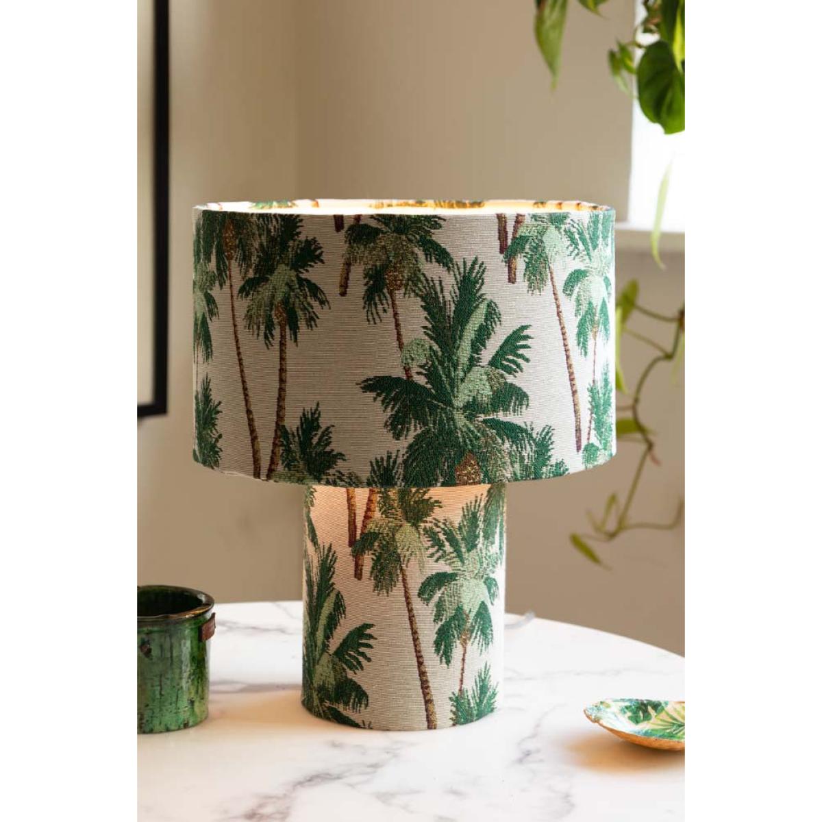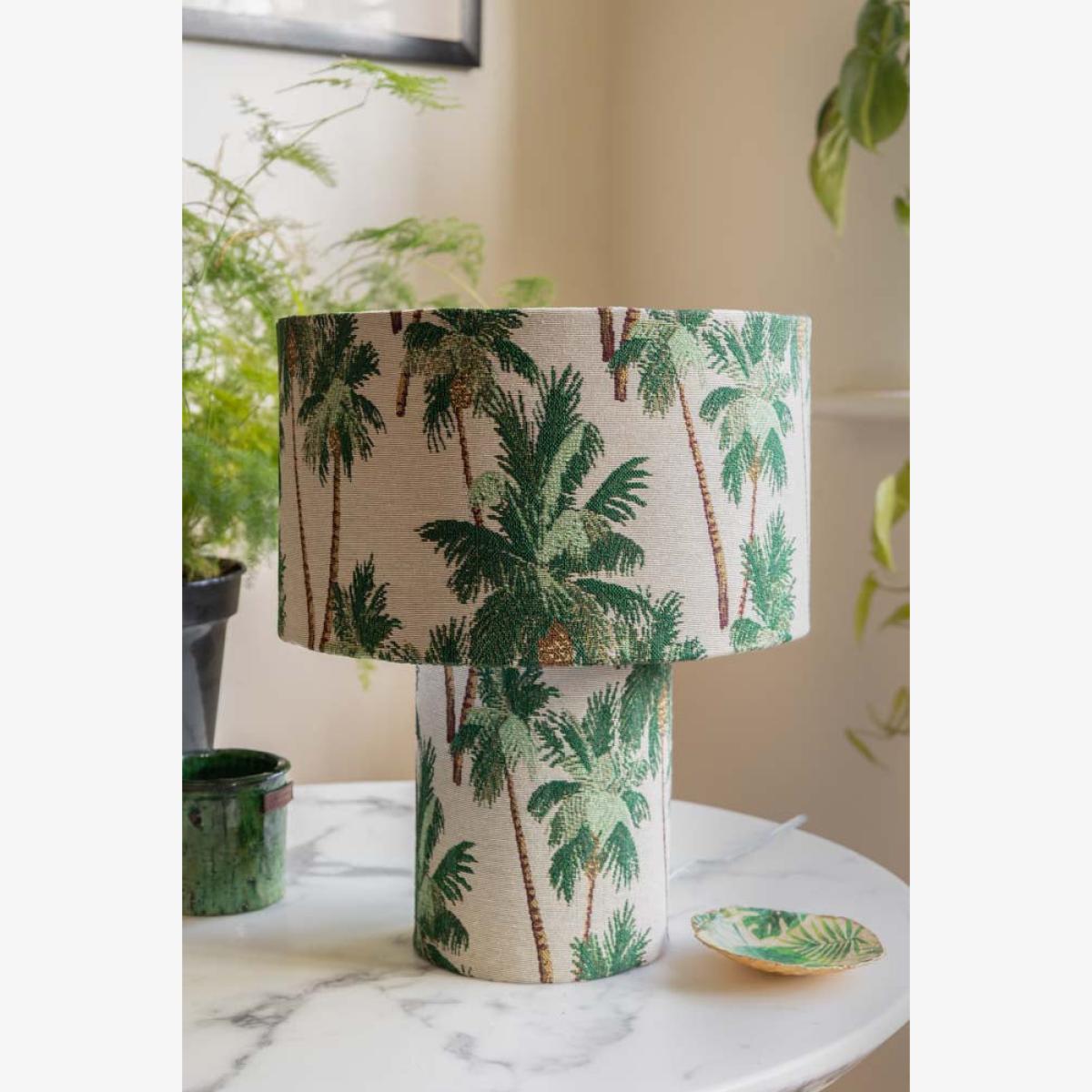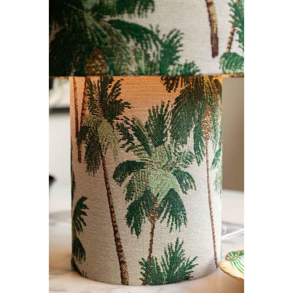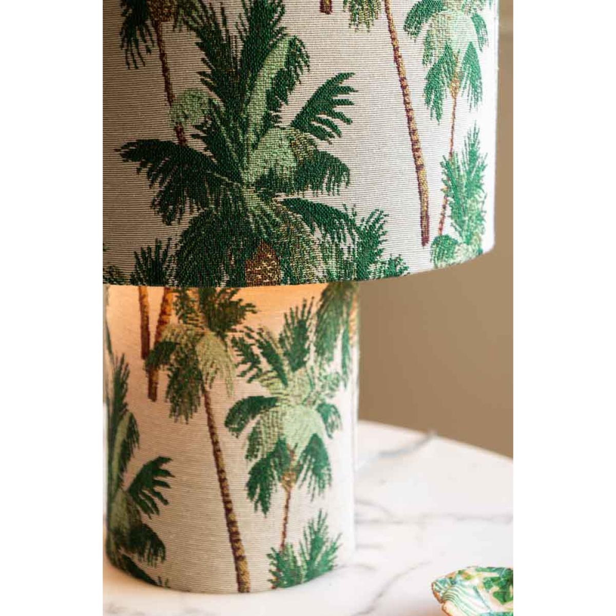 Bring a touch of the tropics right into your home with the Tropical Palms Table Lamp. This contemporary lampshade features delicate tapestry effect with beautiful palm trees all over, with fresh green leaves and soft brown trunks standing out against the crisp white backdrop. It's like having your very own mini-holiday on your desk or bedside! Not only does it give off a breezy, holiday vibe - it also adds a pop of style to any room, balancing laid-back vibes with chic sophistication. Whether you're dreaming of sandy beaches or just want a little extra style in your space, this lamp works perfectly as a bedside table lamp or desk lamp. Plus, it's amazing for brightening up your home in a way that's both fresh and oh-so-stylish. Let the tropical vibes flow. Tropical Palms Table Lamp Measures: D16cm x H38cm Materials: Fabric
