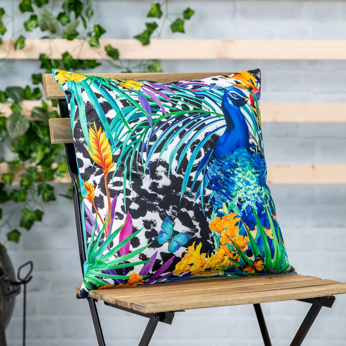 Featuring a tropical bird design with colourful botanicals, this vibrant outdoor cushion is sure to bring a touch of personality and expression to any space. Designed with 100 percent waterproof fabric, this patterned cushion is ideal for both indoor and outdoor use. Stylish and comfortable thanks to its plump fibre filling, this cheerful cushion is perfect for adding a decorative touch to your outdoor furniture. Extend its life by simply wiping clean any spillages and storing them in a cool, dry place indoors - ready to bring outside when the warmer weather arrives on fresh spring and bright summer days.