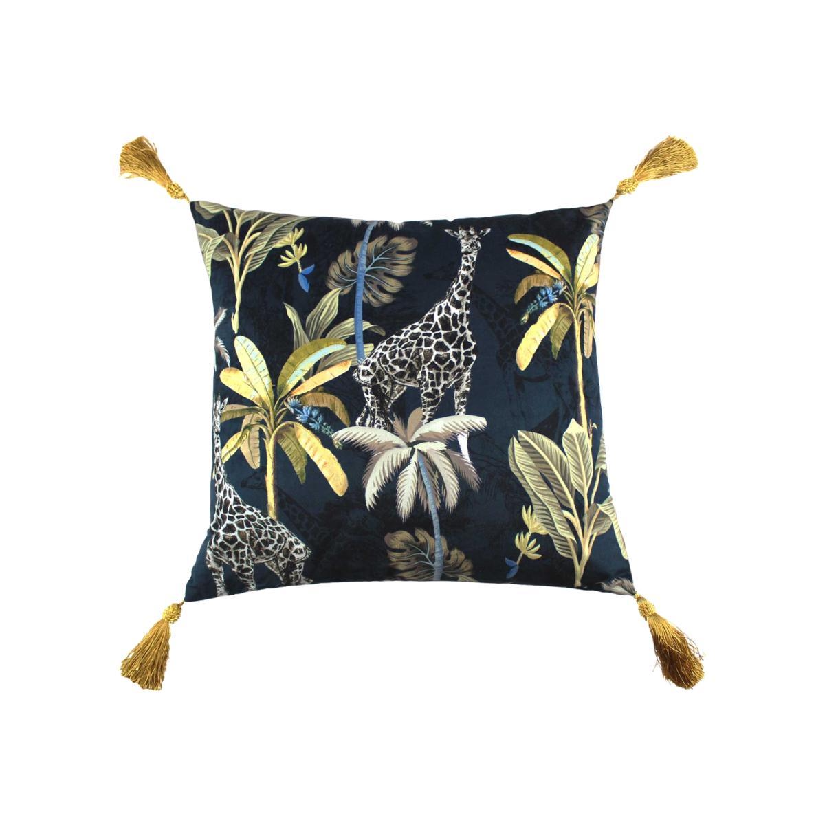 Design. Add a touch of tropics to your home witht the comforting Tropical Tassel Cushion. An on trend accessory that will add character to any space, comprising banana leaf trees, giraffes and tassles to each corner. We recommend styling this piece with a mustard or navy cushion for a dimensional look.
