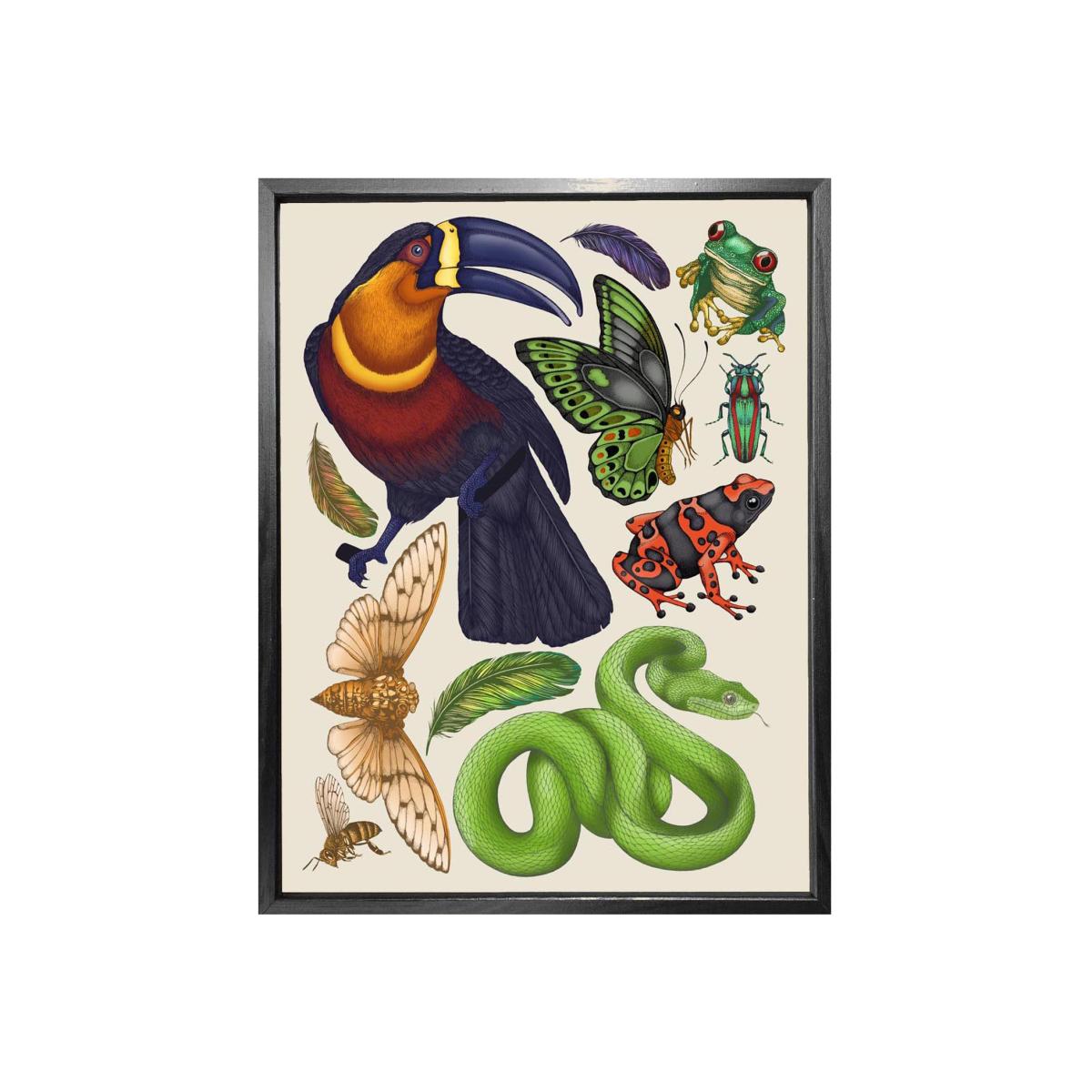 'Tropical Toucan, 2021' is from the Hybrid series of hand-illustrated prints by Emily Carter. Works feature amalgamations of different creatures, creating surreal hybrids that stretch the imagination. Emily's illustration style is inspired by technical scientific drawings of the Victorian era combined with a lifelong interest in wildlife and natural history. Each drawing is illustrated entirely by hand using pen; a technique which has taken many years to perfect. Fine Art Print on 350gsm paper Signed by the Artist Sold Unframed Printed in London