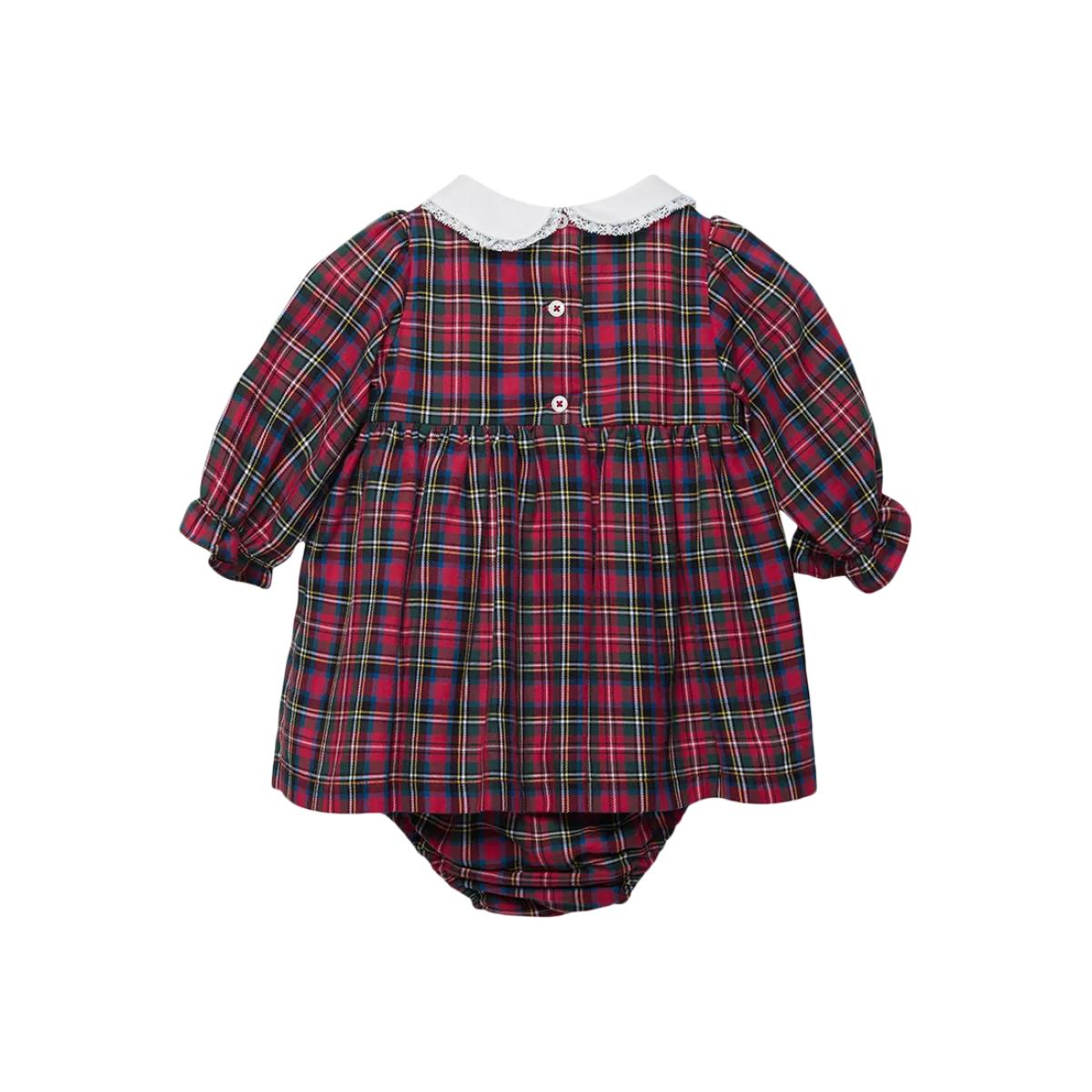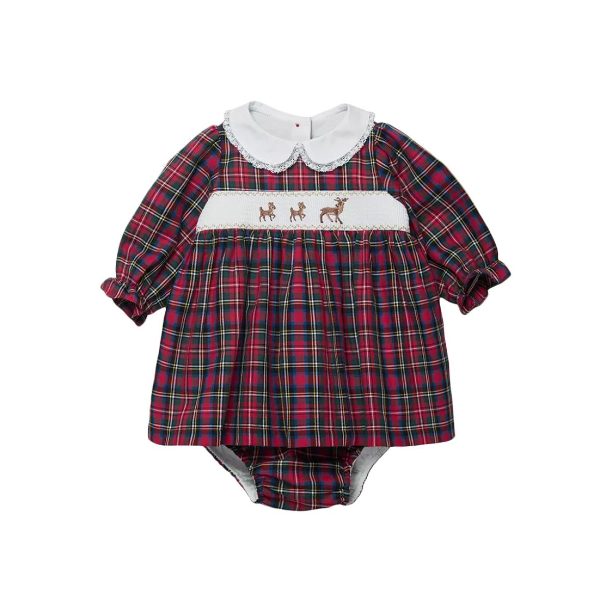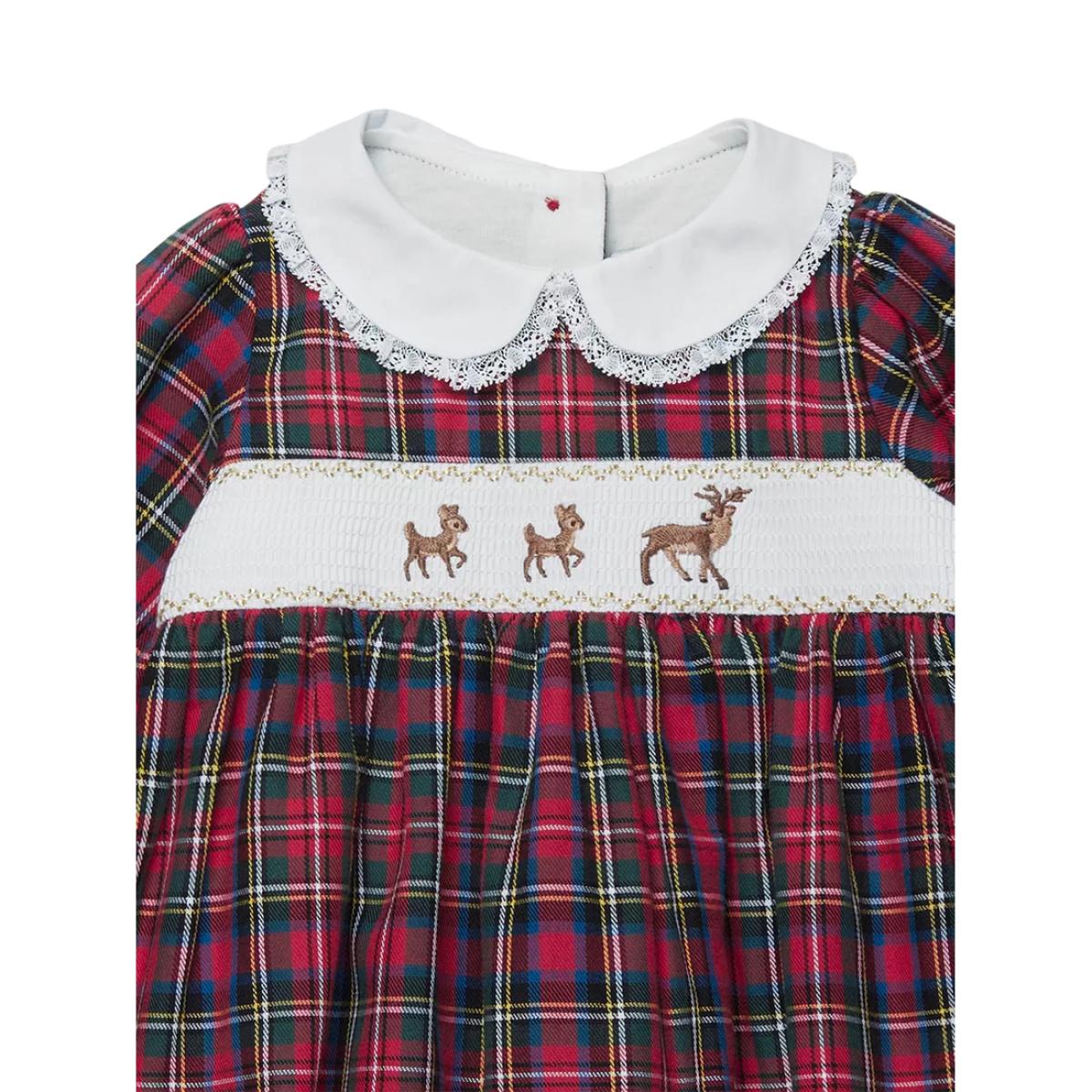 This adorably festive tartan check dress features long sleeves with elasticated cuffs, a delicate white lace trimmed woven collar and miniature fawn embroidered detailing. Fully lined in soft cotton, it comes with a pair of matching knickers.