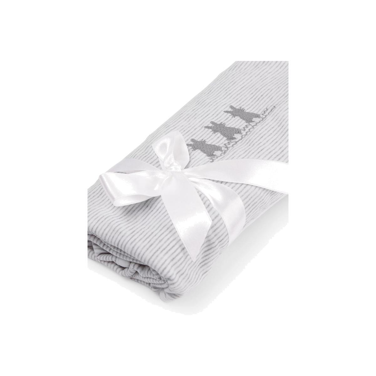 The Trotters bunny blanket is made in a super soft striped cotton jersey and features sweet embroidered bunnies on the bottom corner. Finished with contrast binding and a picot edge, this blanket is ideal for taking on the go and makes a lovely gift for newborns.