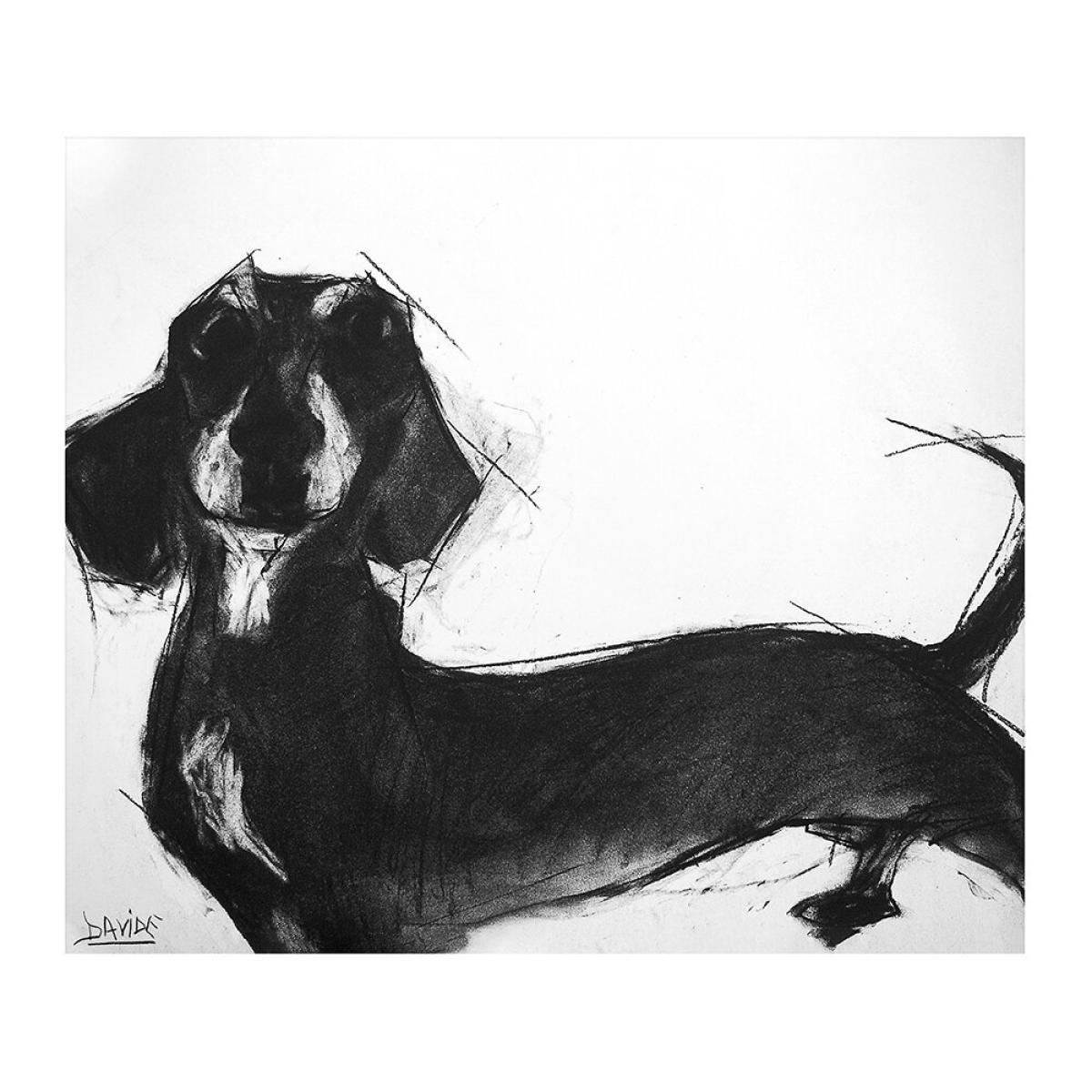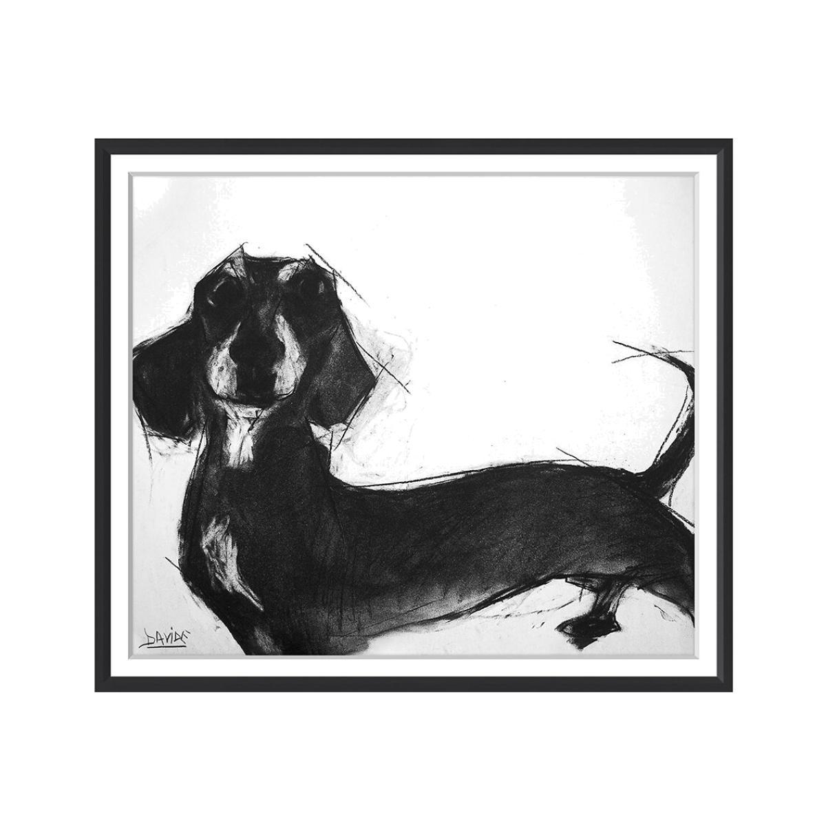 This Dogs print by Valerie Davide will add some charm to any interior. A charcoal drawing on white rag watercolour paper, this print features a spontaneous outpouring of energy that’s both distinctive and full of life resulting in an expressive sausage dog. Framed in a black wooden frame, it’s ideal for any dog lover’s home.