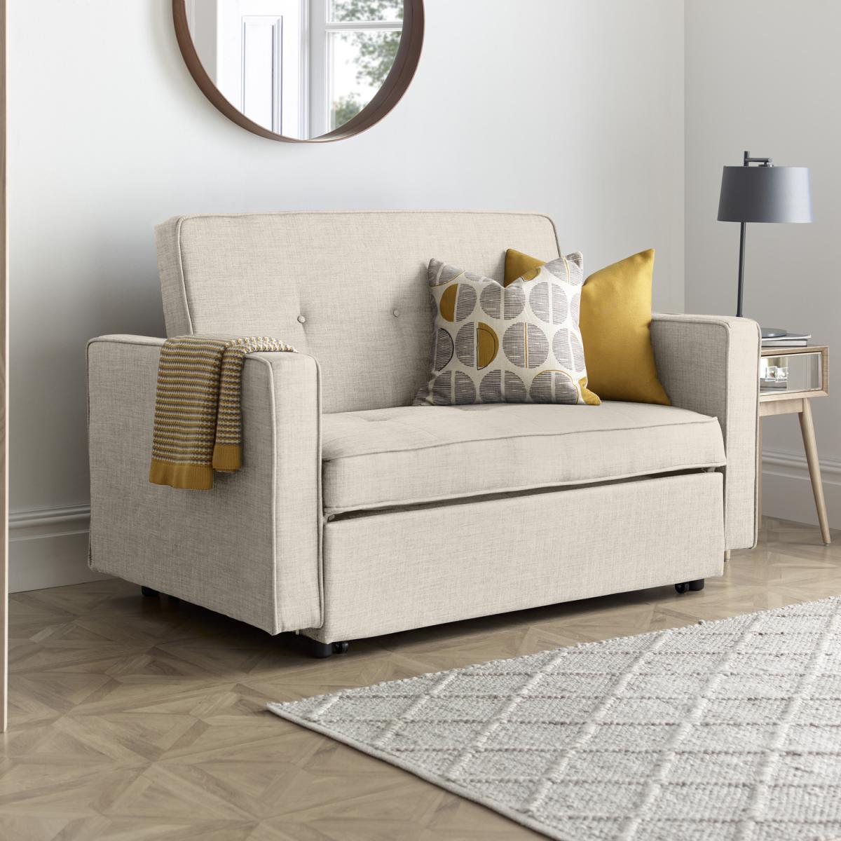 The Troy Sofa Bed is the perfect space-saving solution, blending contemporary design with effortless functionality. A contemporary sofa bed with a minimalist design, suitable for any modern setting. Whether you need an occasional guest bed or a stylish sofa, this fold-out sofa bed transforms seamlessly with just a few simple adjustments. Crafted with a pine and plywood frame, the Troy Sofa Bed is both sturdy and durable, while the linen-blend fabric adds a sophisticated touch to any living space. Designed for both comfort and practicality, it features foam-filled cushions with a sinuous spring seat, providing supportive yet cosy seating. The adjustable backrest ensures easy reclining, making relaxation effortless. Fabric handles for easy movement.