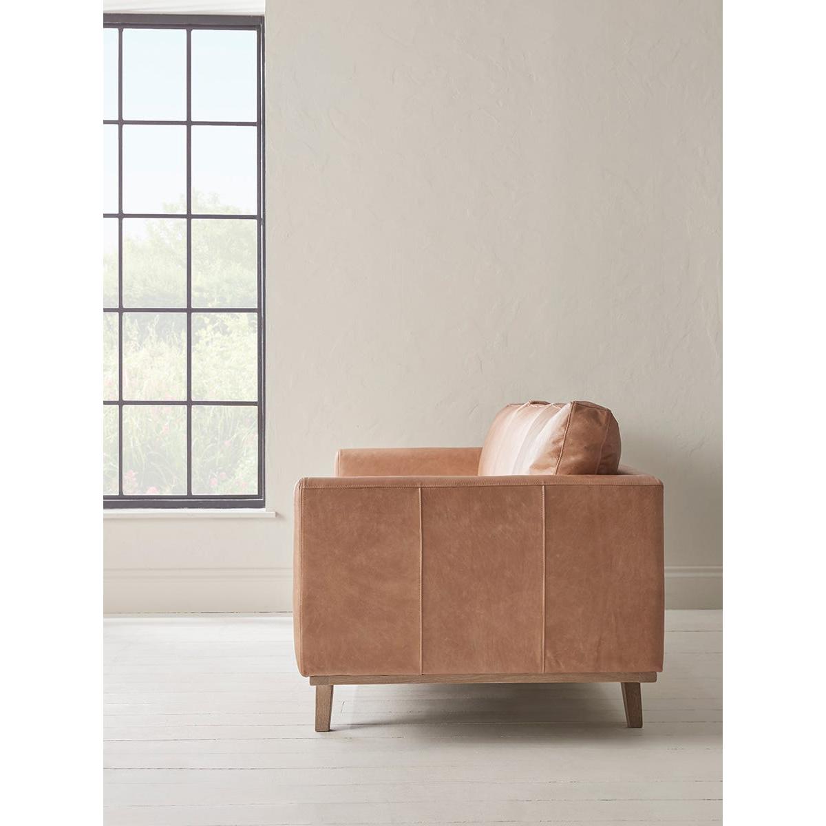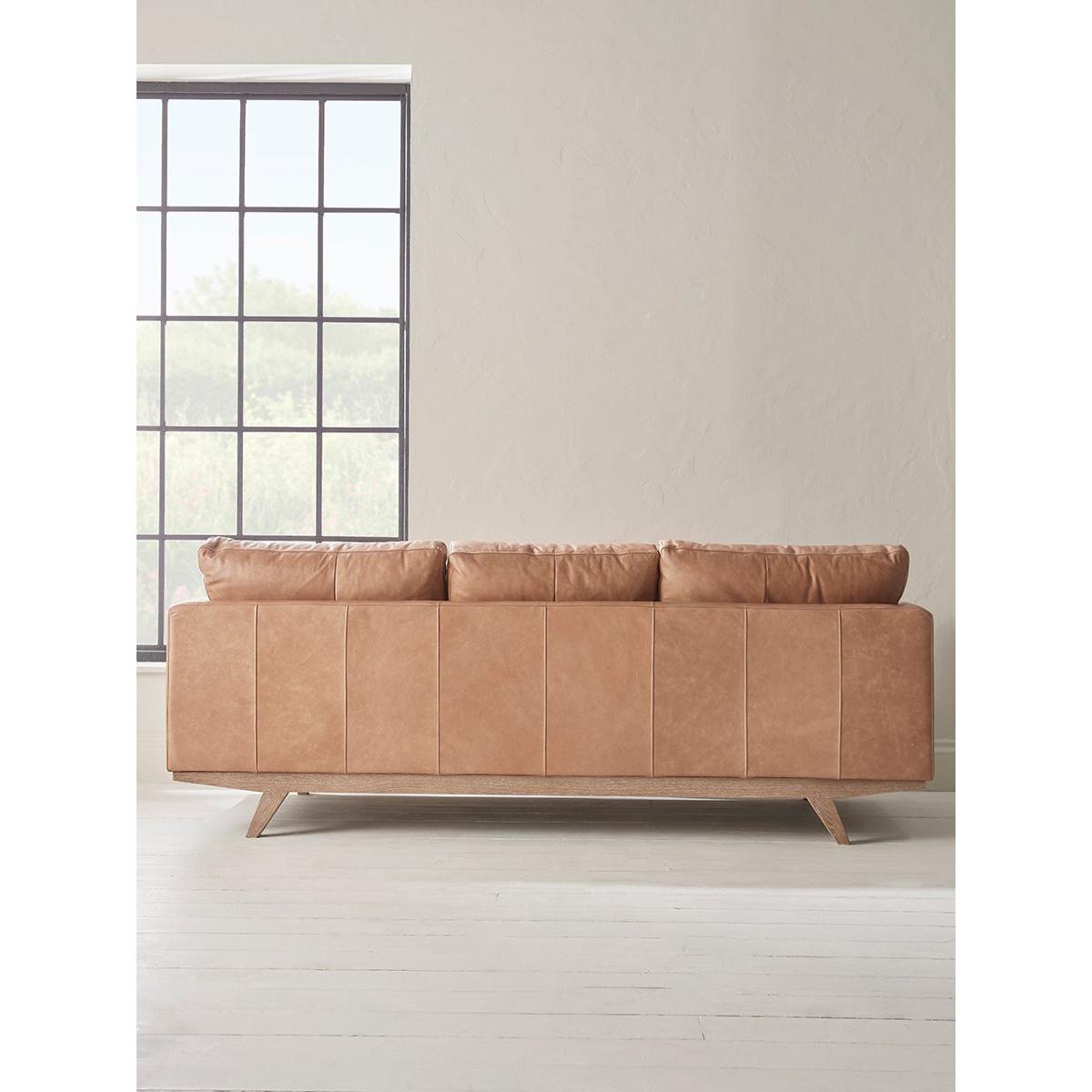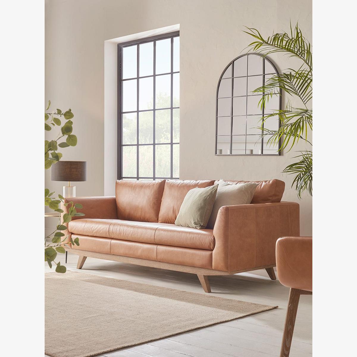 Simple in design, our Troyes sofa adds warmth to your living space. The rich tan leather paired with lightly distressed  wooden legs creates an aged look to add rustic charm into your space. Seams along the sides and back add to the laid-back feeling of this sofa, suiting an industrial interior scheme perfectly.