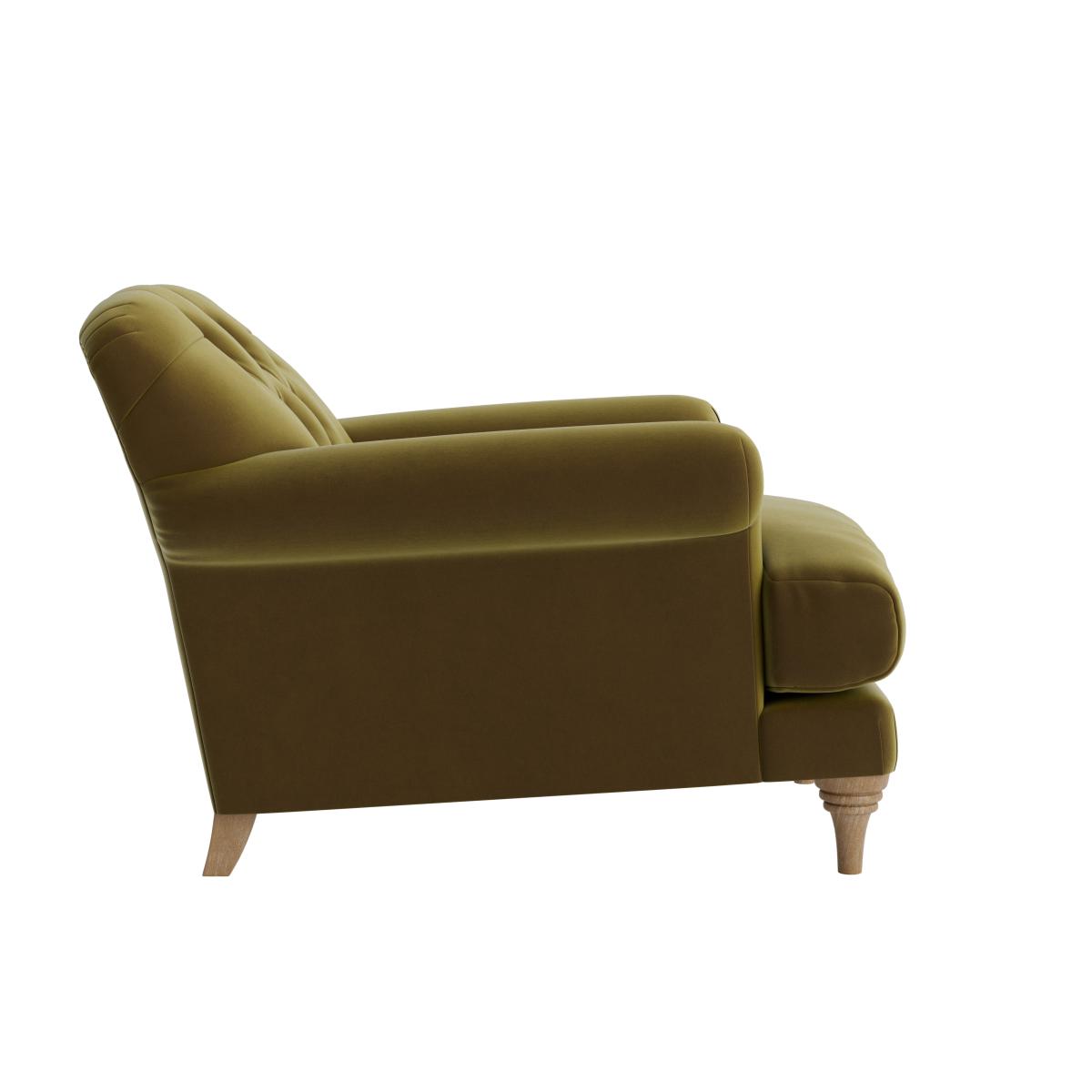 I love this armchair for its plush, inviting look and versatility across various interior styles. Its rich, olive-green velvet adds a touch of luxury, making it a statement piece in both contemporary and more traditional schemes. It works particularly well in eclectic, vintage-inspired, or retro interiors, where its timeless shape and bold colour can really shine. For styling tips, consider pairing it with neutral-toned cushions or a textured throw to add warmth. It also works beautifully as a standalone feature or as part of a cosy corner, and matching it with wooden or brass accessories can enhance its classic appeal. Keep the surrounding décor simple to allow the chair to be the focal point, or contrast it with patterned fabrics for added visual interest.
