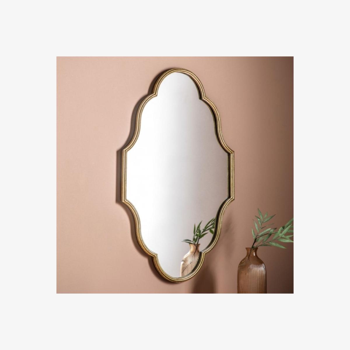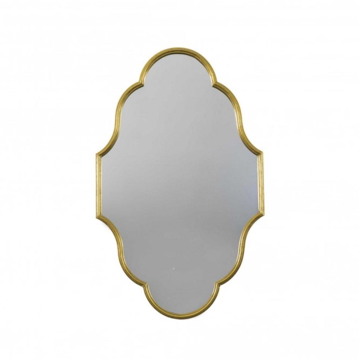 Shape: Irregular. Material:Glass / Iron / MDF. Colour/Finish: Gold. Elegant mirror with gold coloured metal frame. A lovely decorative piece for above a console or dressing table which is both decorative and practical.