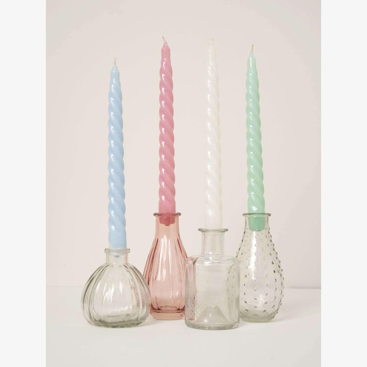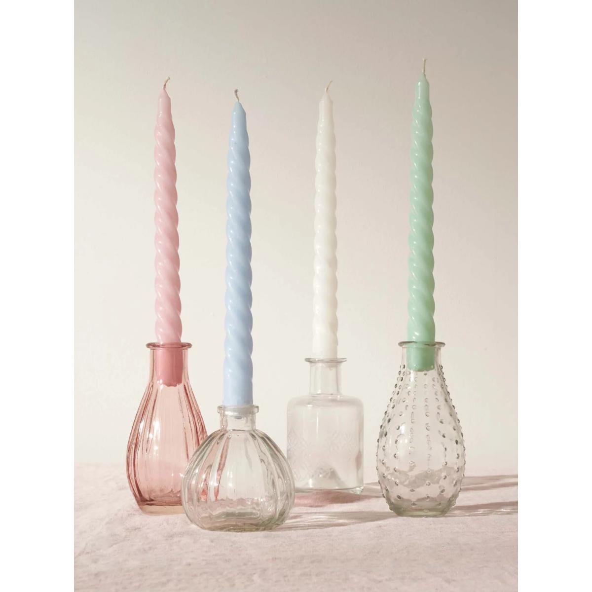 Introduce a soft pop of colour to your dining table with this set of four twisted candlesticks in a rainbow of soft pastels. Made in Portugal, the sleek, tapered silhouette follows the form of a traditional candlestick with the addition of a delicate swirl design to bring a pretty and playful feel to your home.