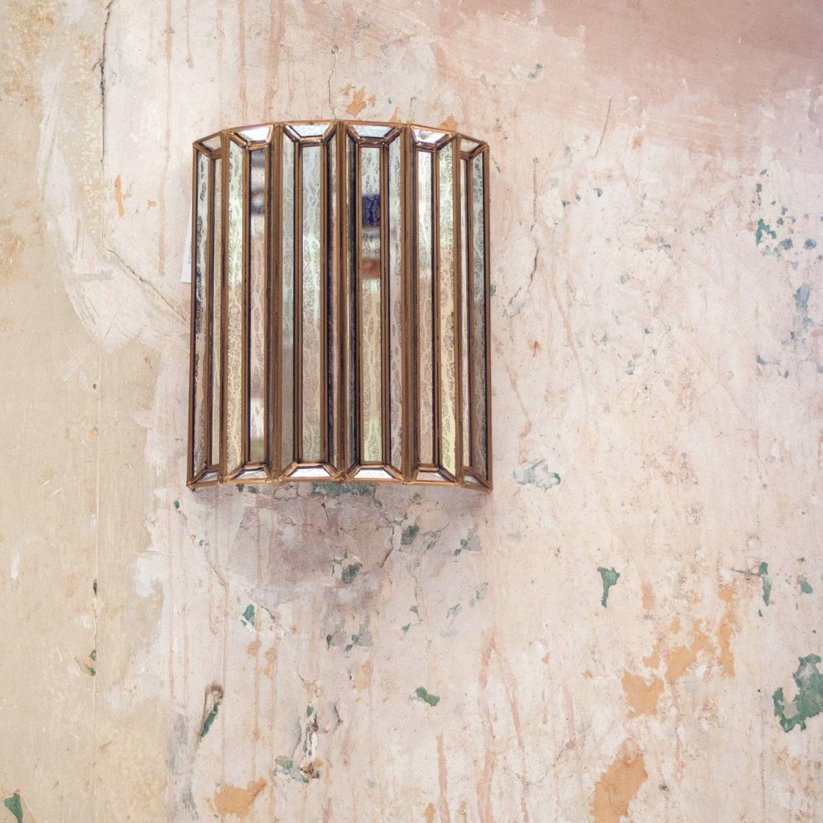 Handcrafted from slender pieces of mottled glass and held together in an iron frame with a rustic brass finish, our Truman wall light will add a touch of art deco glamour to your home. H30 x W27 x D14cm. Made of iron and glass. Antique brass finish. Requires 1 x E27 Max 60W (not included). Clean with a soft dry cloth. We recommend consulting a qualified electrician for installation guidance.
