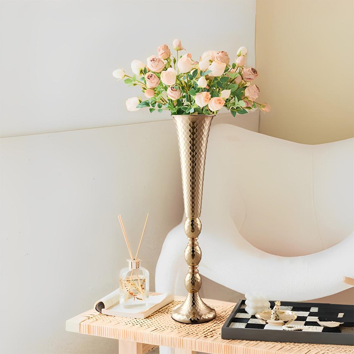 This metal vase is designed to enhance event ceremonies with its dazzling gold colour and elegant trumpet-shaped design. The intricate diamond pattern on the surface showcases exceptional taste and craftsmanship. Made from high-quality metal, it is durable and easy to maintain, serving as a striking focal point for the event.