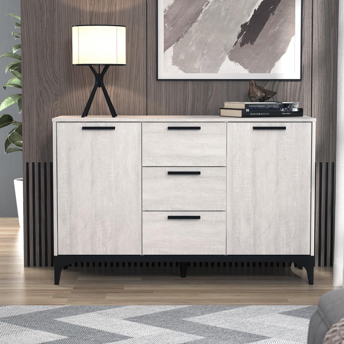 Offer an expansive and versatile sideboard that is solid, secure, and resistant to deformation. Easy to open and close drawers and two doors are perfect for holding small items like keys and treats. There is plenty of room inside the compartment for storing small household appliances, wine, and crockery. This cabinet's simple, refined, and exquisite design is sure to draw attention. The sideboard meets your needs for a kitchen sideboard in addition to being a good choice for a living room and hallway cabinet. Whatever style you're going for modern, Scandinavian, or vintage the sideboard will work for you. The generously size-wise, straightforward silver handle has a warm touch that guards against scratches and injuries while in use. With the thorough instructions and accessories provided, assembly won't be a problem for you. Each component has its own label, and instructions are provided for all hardware. Total Measurements: W115.8, D39.8, H74.2 cm