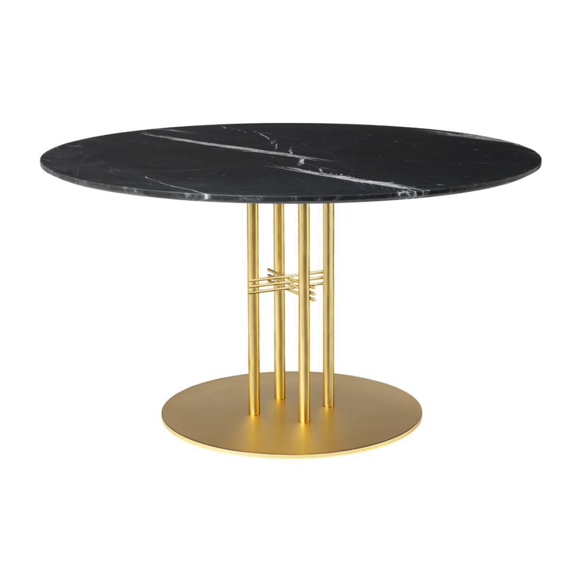 The creation of young design duo, Enrico Fratesi and Stine Gam, the large TS Column Table showcases a brass base topped with a configurable marble table top to lend a touch of contemporary elegance to any space. The elegant marble top, available in Bianco Carrara Marble, Verde Guatemala Marble and Nero Marquina Marble, rests on a brass stem finished with an expertly crafted brass disc at its base. The TS Column Table embodies Gam. Fratesi's idea that their work is 'balancing between the traditional and surprising'. Created with classic materials paired with a modern, clean-lined aesthetic, Gam Fratesi has designed the TS family of tables with a sharp eye for detail and an uncomplicated approach. Intricately manufactured by Gubi, the TS Column Table in brass and marble top is created to exacting specifications to ensure it is finished to the highest quality.