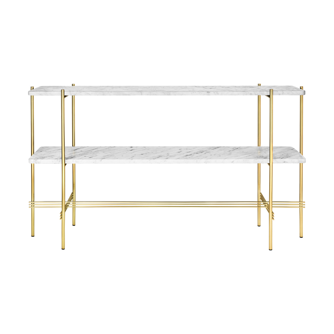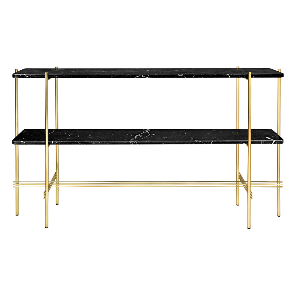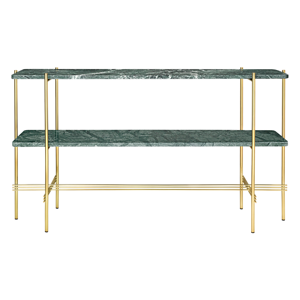 The creation of young design duo, Enrico Fratesi and Stine Gam, the TS Console showcases an elegant brass base and a choice of two marble racks, perfect for adding dimension to any space. Crafted in a tall height with two surfaces, the TS Console Double Rack contrasts its surfaces with beautiful brass legs with cross-strut detailing, embodying GamFratesi's ideal that their work is 'balancing between the traditional and surprising'. Created with classic, durable materials paired with a modern, clean-lined aesthetic, GamFratesi has designed the TS family of tables and consoles with a sharp eye for detail and an uncomplicated approach. Intricately manufactured by Gubi, the TS Console with a brass base is available in a choice of marble finishes and is created to exact specifications to ensure it is finished in the highest quality.