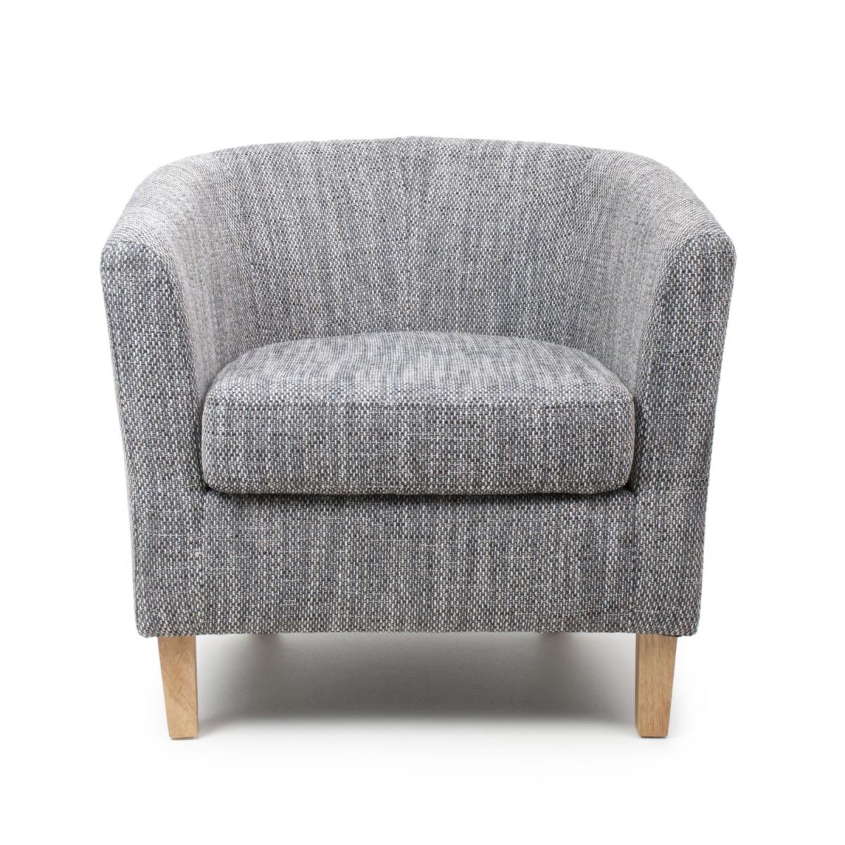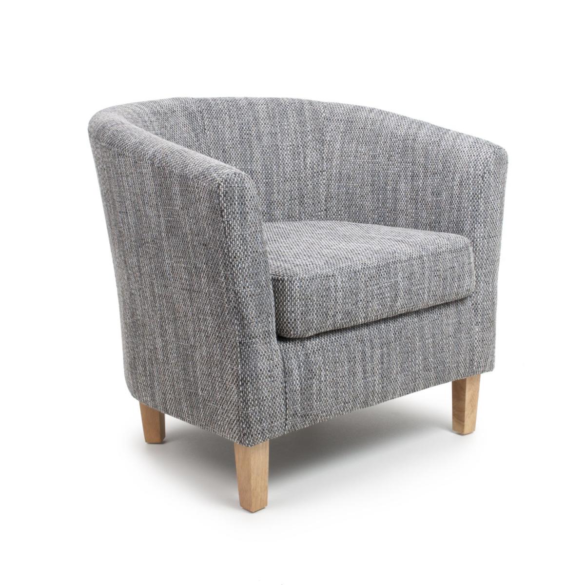 A classic Tub Chair with matching footstool, upholstered in fashionable grey tweed. The chair comes with a comfortable seat cushion. Supplied with natural rubberwood legs.