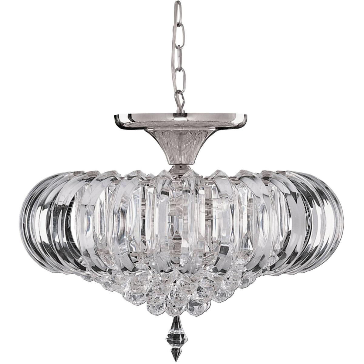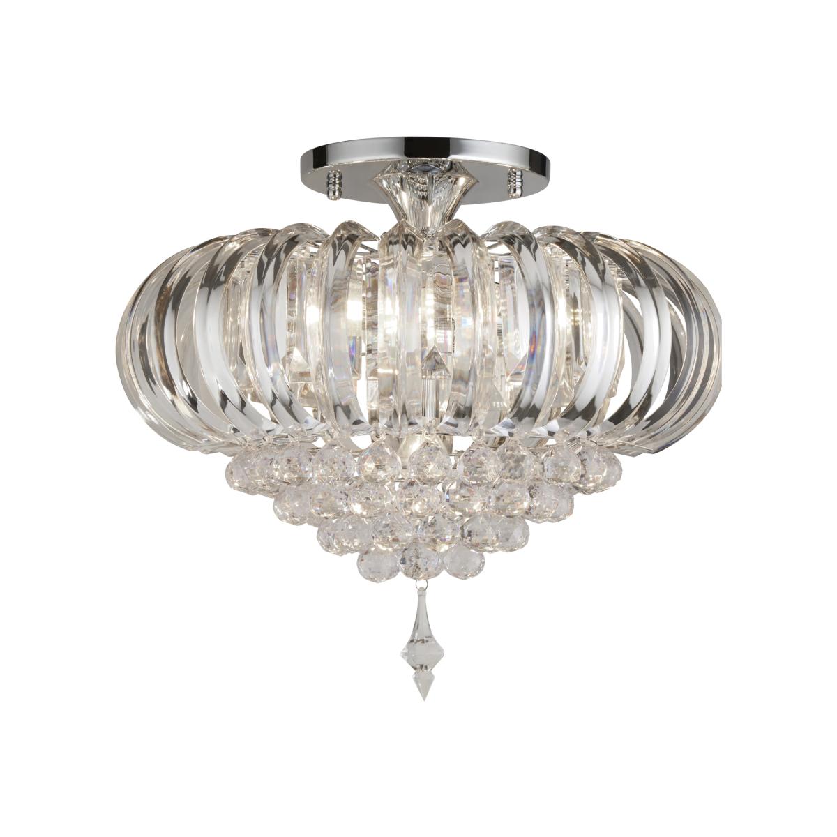 This 5 light semi-flush ceiling fitting is a blend of vintage elegance and bold design. The chrome finish frame is adorned with clear crystal balls and draped in cascades of shimmering acrylic prisms which reflect the five lights beautifully for a glamorous elegance. Ideal for any living space or hallway.