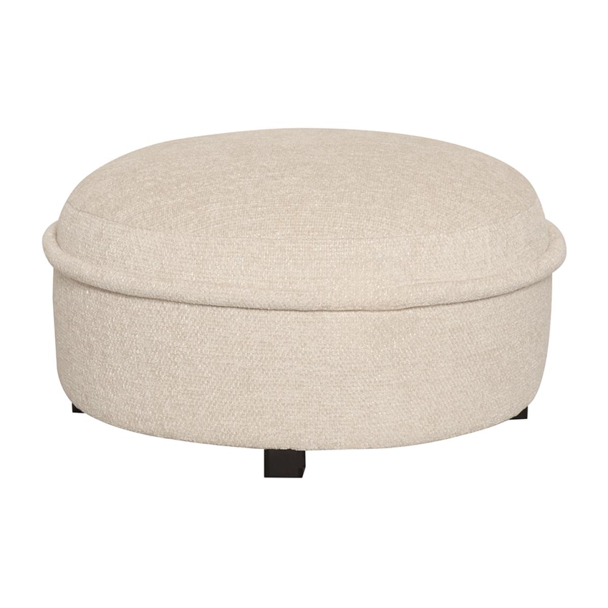 A distinctive contemporary footstool with a playful puffy form. Deep foam padded seat. Upholstered in a soft, luxurious, polyester chenille fabric.