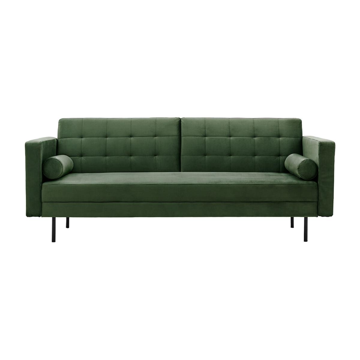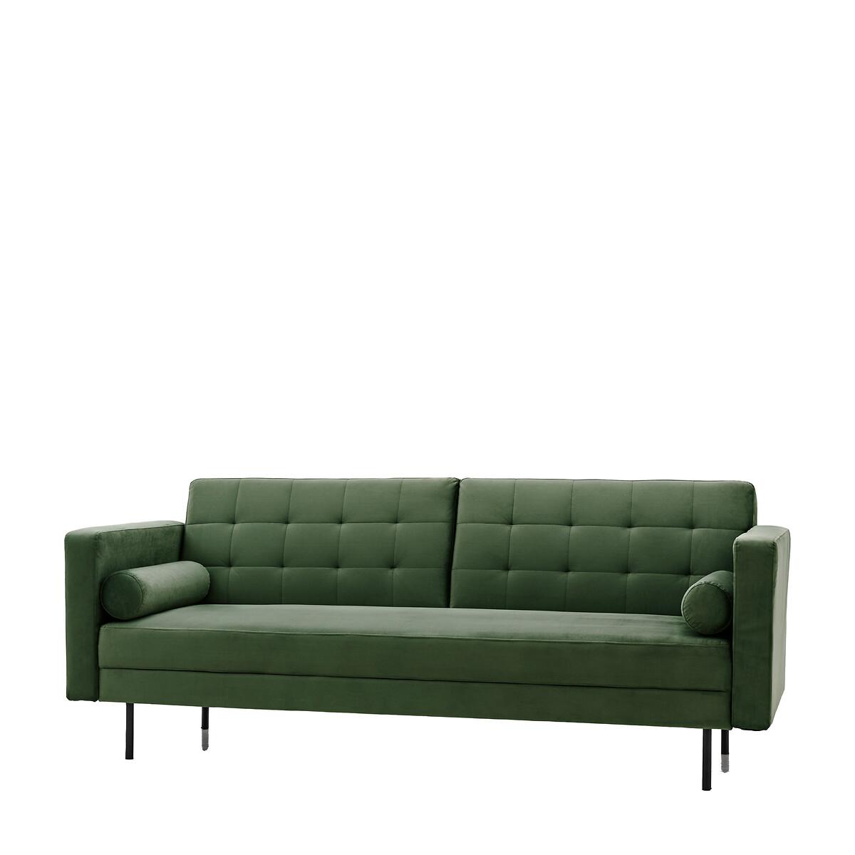 Stylish contemporary design meets practicality in the Arlington Sofa Bed. Perfect for accomodating extra guests, the back quickly and simply folds down to create a bed. Slim straight arms are softened by round bolster cushions, creating a beautiful piece inspired by mid-century design, all finished off with contemporary black metal legs. Product details• Click-clack opening mechanism• Velvet Upholstery• Matching bolster cushions included• Slim metal legs• Pine wood frame• Seats 3• Folds out to reveal a sleeping space that can accomodate two sleepers (roughly the size of a small double)• Seat Filling - Foam• Back Filling - Foam• Seat Firmness - Medium• Back Firmness - Medium• 12 month manufactuers warranty. Product Composition - Pine 45% / Foam 23% / Fabric 13% / Plywood 10% / Iron 9%Product Dimensions - 80 cm x 206 cm x 81 cm , Weight - 42.4 KGSeat Height - 46 cm. Seat Width-190 cm. Seat Depth - 58 cm Leg / Feet Height - 18 cm Clearance to Floor - 18 cm. Sleeping area dimensions - 188 cm x 110 cm Package Dimensions - 193 cm x 113 cm x 28 cm, Weight 49 kg. This product will be dispatched by one of our trusted suppliers. You’ll be contacted by their selected courier about your delivery. Please note: this product cannot be delivered to all Offshore Islands, Northern Ireland or Republic of Ireland. GALLE01