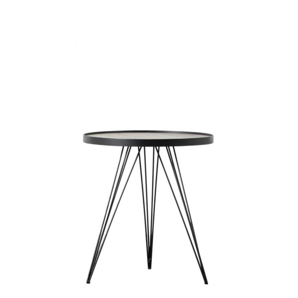 Side table offering a contemporary twist on an industrial look. The angular legs and frame around the table top are crafted from black metal, whilst the inset top is faux timber. A matching coffee tables is available. The tables are part of our Packed-Flat Design Project, offering easy delivery to any room in any property, whilst reducing the packaging needed. Easy assembly is required, but all the tools needed are supplied.